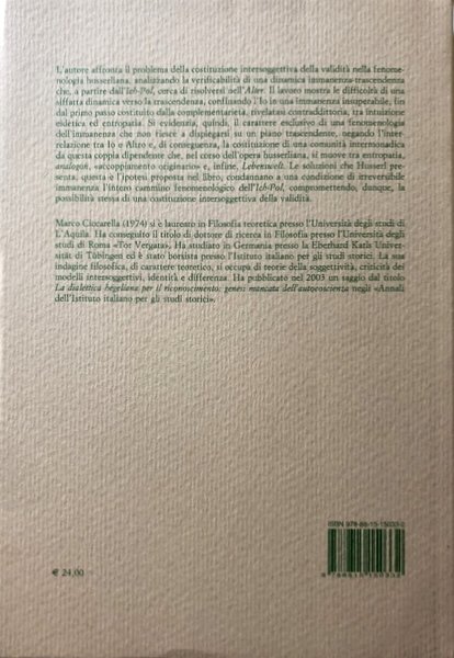 Il volume affronta il problema della costituzione intersoggettiva della validità nella fenomenologia husserliana, analizzando la verificabilità di una dinamica immanenza-trascendenza che, a partire da Ich-Pol, cerca di risolversi nell'Alter. Il lavoro mostra le difficoltà di una siffatta dinamica verso la trascendenza, confinando l'Io in una immanenza insuperabile, fin dal primo passo costituito dalla complementarietà, rivelatasi contraddittoria, tra intuizione eidetica ed entropatia. Si evidenzia, quindi, il carattere esclusivo di una fenomenologia dell'immanenza che non riesce a dispiegarsi su un piano trascendente, negando l'interrelazione tra Io e Altro e, di conseguenza, la costituzione di una comunità intermonadica da questa coppia dipendente che, nel corso dell'opera husserliana, si muove tra entropatia, analogon, "accoppiamento originario" e, infine, Lebenswelt. Le soluzioni che Husserl presenta, questa è l'ipotesi proposta nel libro, condannano ad una condizione di irreversibile immanenza l'intero cammino fenomenologico dell'Ich-Pol, compromettendo, dunque, la possibilità stessa di una costituzione intersoggettiva della validità.