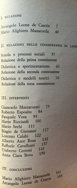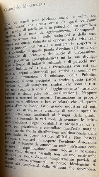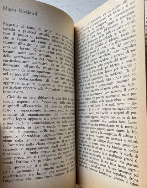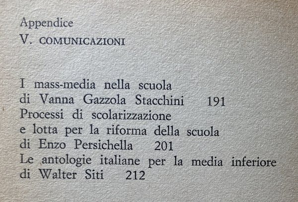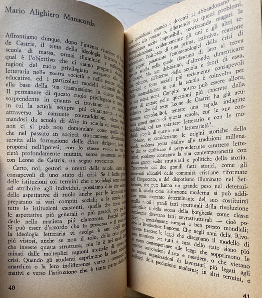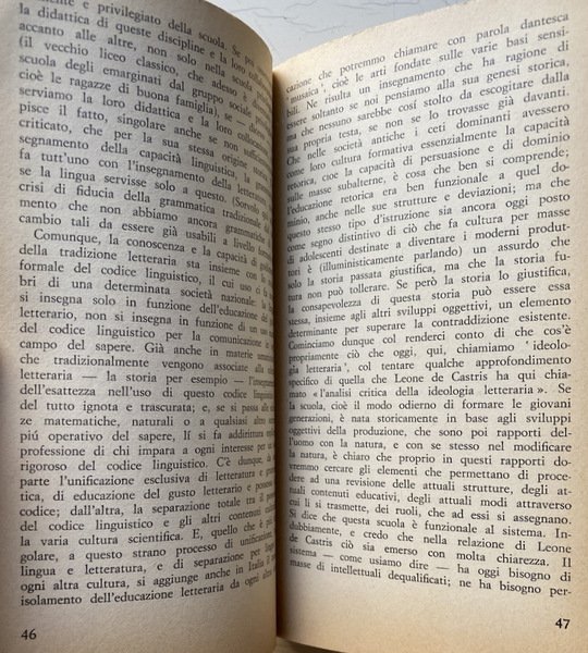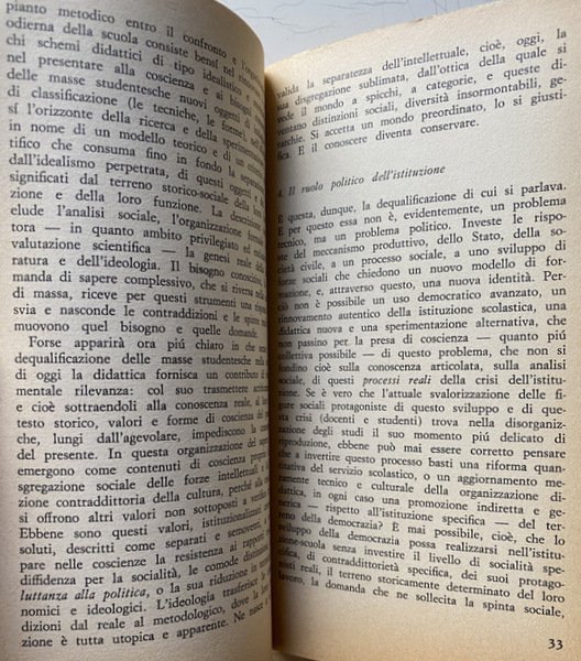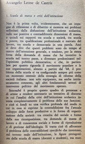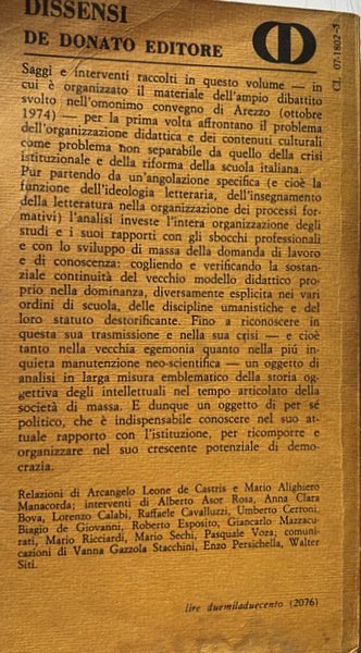 Soggetti: Pubblica Istruzione, Scuola di massa, Educazione permanente, Pedagogia, Formazione, Didattica, Insegnamento, Apprendimento, Politica culturale, Istituzioni, Scuole, Docenti, Studenti, Riforma scolastica, Italia, Anni Sessanta, Anni Settanta, Dopoguerra, Giovanni Gentile, Benedetto Croce, Sinistra, Marxismo, Partiti politici, Scuole di pensiero, Giovani, Potere, Ideologie politiche, Metodi, Valutazione, Giudizio, Sapere, Scienze, Materie, Problemi, Classi sociali, Alfabetizzazione, Obbligo, Letteratura, Studi culturali, Dibattiti, Critica, Seminari, Atti, Convegni, Discussioni, Riferimento, Consultazione, Intellettuali, Professori, Baroni, Università, Baronaggio, Sud, Divario culturale, Nord, Diritto allo studio, Collezionismo, Articoli, Interventi, Saggi, Raccolte, Libri Vintage Fuori catalogo, Ideologia letteraria, Egemonia, Classi dirigenti, Competenze, Meritocrazia, Fascismo, Storia, Testi scolastici, Strumenti didattici, Insegnare, Liceo, Superiori, Sbocchi professionali, Lavoro, Democrazia, Livellamento, Umanistica, Geografia, Latino, Greco, Lingue, Linguistiche, Italianistica, Italiano, Grammatica, Matematica, Tecnica, Attualità, Saperi, Discipline, Disoccupazione, Crisi, Esami, Laurea, Sindacati, Disfunzioni, Sessantotto, Movimenti studenteschi, Proteste, Economia, Produzione, Stato, Scolarizzazione, Libertà, Specializzazione, Facoltà umanistiche, Liberalizzazione, Autonomia, Piani di studio, Autogestione, Finanziamenti, Libertà, Classismo, Disimpegno, Lotta di classe, Coscienza, Capitalismo, Borghesia, Egemonia borghese, Conflitti, Trasmissione, Tradizione, Manuali, Storicismo, Industria editoriale, Editoria, Stampa, Sussidi, Famiglia, Emarginazione, Immigrati, Inclusione, élites, Corsi di aggiornamento, Enti privati, Riqualificazione, Sperimentazione, Media inferiore, Antologie italiane, Public education, Mass school, Continuing education, Pedagogy, Training, Didactics, Teaching, Learning, Cultural policy, Institutions, Schools, Teachers, Students, School reform, Italy, Sixties, Seventies, Postwar, Left, Political parties, Thought, Young people, Power, Political ideologies, Methods, Evaluation, Judgment, Knowledge, Sciences, Subjects, Problems, Social classes, Literacy, Obligation, Literature, Cultural studies, Debates, Criticism, Seminars, Proceedings, Conferences, Discussions, Reference, Consultation, Intellectuals, Professors, Barons, University, Baronage, South, Cultural gap, North, Right to study, Collecting, Articles, Interventions, Essays, Collections, Out of print books, Literary ideology, Hegemony, Executive classes, Skills, Meritocracy, Fascism, History, School texts, Didactic tools, Teach, High school, Higher, Career opportunities, Work, Democracy, Leveling, Humanities, Geography, Latin, Greek, Languages, Linguistics, Italian, Grammar, Mathematics, Technique, Current affairs, Knowledge, Disciplines, Unemployment, Crisis, Exams, Degree, Unions, Dysfunctions, Sixty-eight, Student movements, Protests, Economy, Production, State, Schooling, Freedom, Specialization, Humanities faculties, Liberalization, Autonomy, Study plans, Self-management, Financing, Freedom, Classism, Disengagement, Class struggle, Consciousness, Capitalism, Bourgeoisie, Bourgeois hegemony, Conflicts, Transmission, Tradition, Manuals, Historicism, Publishing industry, Publishing, Press, Subsidies, Family, Marginalization, Immigrants, Inclusion, Refresher courses, Private bodies, Retraining, Experimentation, Lower average, anthologies