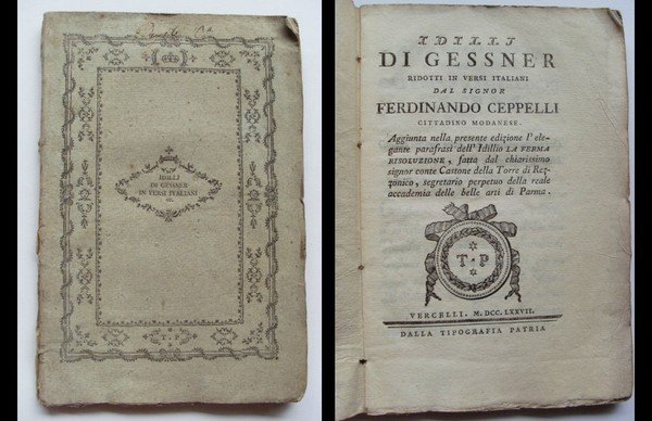 *Idillj di Gessner ridotti in versi italiani dal Signor Ferdinando Ceppelli cittadino modenese. Aggiunta nella presente edizione l'elegante parafrasi dell'Idillio La Ferma Risoluzione, fatta dal chiarissimo Signor Conte Castone della Torre di Rezzonico, segretario perpetuo della Reale Accademia delle Belle Arti di Parma. Idilli di Gessner.