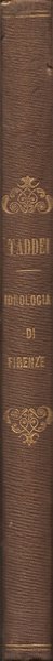 In-8° (24,9 x 16 cm), pp. 206, (2), legatura coeva in mezza tela con applicate ai piatti le copertine originali. Titolo e fregi in oro al dorso; titolo in nero al piatto anteriore e vignetta al piatto posteriore, in entrambi i casi entro cornice decorata con motivi fitomorfi. Tracce d'uso e del tempo alla legatura, in particolare, segni d'umido ai piatti. Con otto tabelle nel testo e una tavola fuori testo, più volte ripiegata, ospitante il Quadro sinottico comparativo delle acque di Firenze e del fiume Sieve. Le tabelle nel testo sono intitolate: Composizione quantitativa dell'acqua di Montereggi importata in Firenze, Composizione quantitativa dell'acqua di Carraja, Composizione quantitativa dell'acqua di Colombaja, Acqua di pozzo nella delegazione o quartiere di S. Maria Novella, Acqua di pozzo nella delegazione o quartiere di S. Giovanni, Acqua di pozzo nella delegazione o quartiere di S. Croce, Acqua di pozzo nella delegazione o quartiere di S. Spirito, Acqua della Sieve. A parte le tracce d'umido segnalate alla legatura, volume fresco e molto ben conservato. Edizione originale. Titolo completo: Idrologia di Firenze, desunta dai resultati dell'analisi chimica comparativamente istituita fra l'acqua potabile attualmente in uso presso la popolazione della ridetta città ed altra acqua con che viene proposto di farne la sostituzione. Rapporto presentato al Municipio di Firenze dal prof. Gioacchino Taddei, Cavaliere dell'Ordine del Merito Toscano, sotto il titolo di San Giuseppe, e di quello dei Santi Maurizio e Lazzaro del Regno Sardo, uno dei XL della Società Italiana delle Scienze residente in Modena, Socio ordinario del I. e R. Accademia economico-agraria dei Georgofili e dell'Ateneo di Firenze, corrispondente della R. Accademia delle Scienze di Torino, della pontificia dei nuovi Lincei in Roma, dell'Istituto Lombardo di Lettere, Scienze ed Arti di Milano, di quello delle Scienze di Bologna, della Società Filomatica di Parigi, della Hunteriana di Londra, di quella di Fisica e d'Istoria Naturale di Ginevra, delle Scienze naturali di Bruxelles, dei Filomati di Lucca, dei Concordi di Rovigo, e di altre sì nazionali che estere.