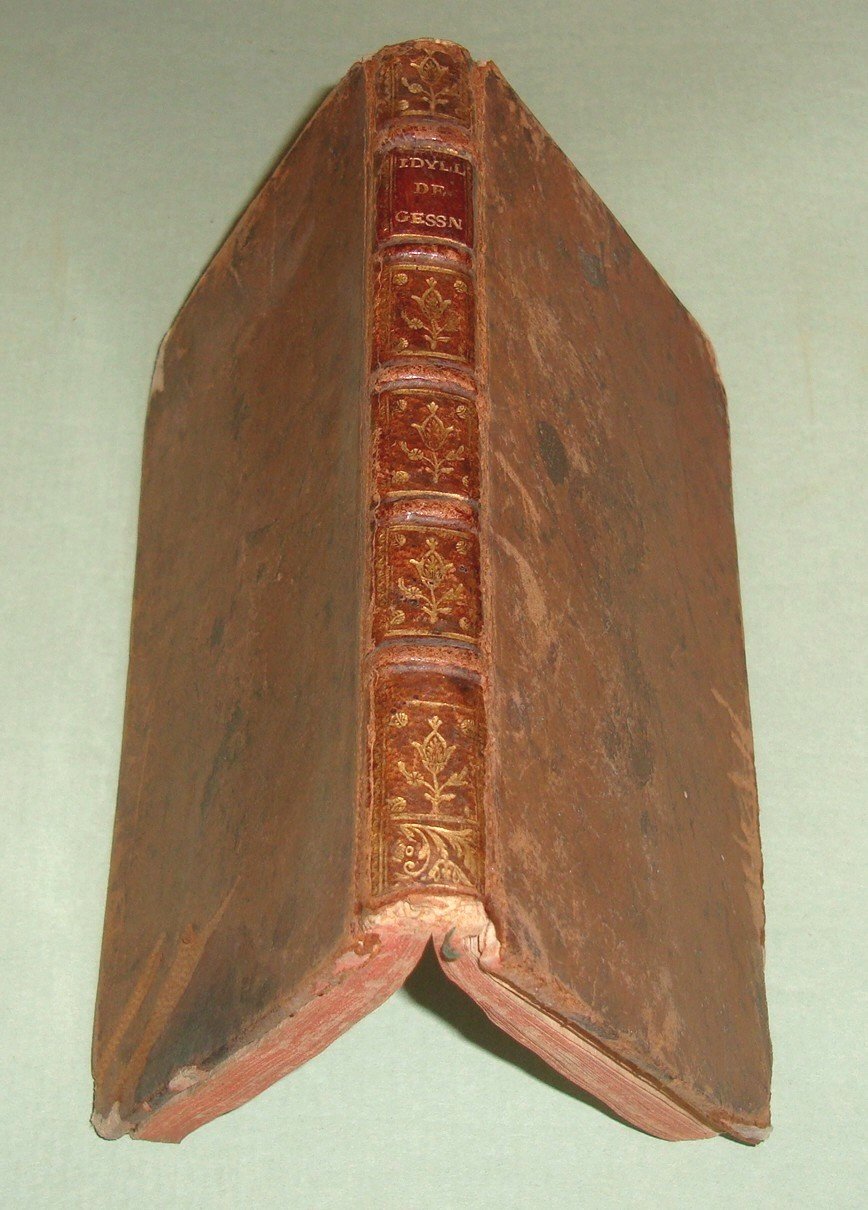 GESSNER Salomon. Idylles et poemes champetres, traduits de l'allemand par M. Huber. A Lyon, chez J. Marie Bruyset, 1762. In 16mo; pp. XLVI, 1 carta n.n. con index, pp. 154, cc. 2 n.nn. con approvazione e privilegio. Antiporta di Lavallée e Poussin incisa da Watelet e 11 testate e culs de lampe di Lavallée e Poussin incisi da Watelet e Marguerite Lecomte. Bazzana coeva stanca, dorso a cordoni con titolo e fregi in oro. Fori da tarlo a qualche pagina che non intaccano il testo. Bruniture. Quadri idilliaci di vita campestre e pastorale. Edizione originale della traduzione francese. Cohen, 432.