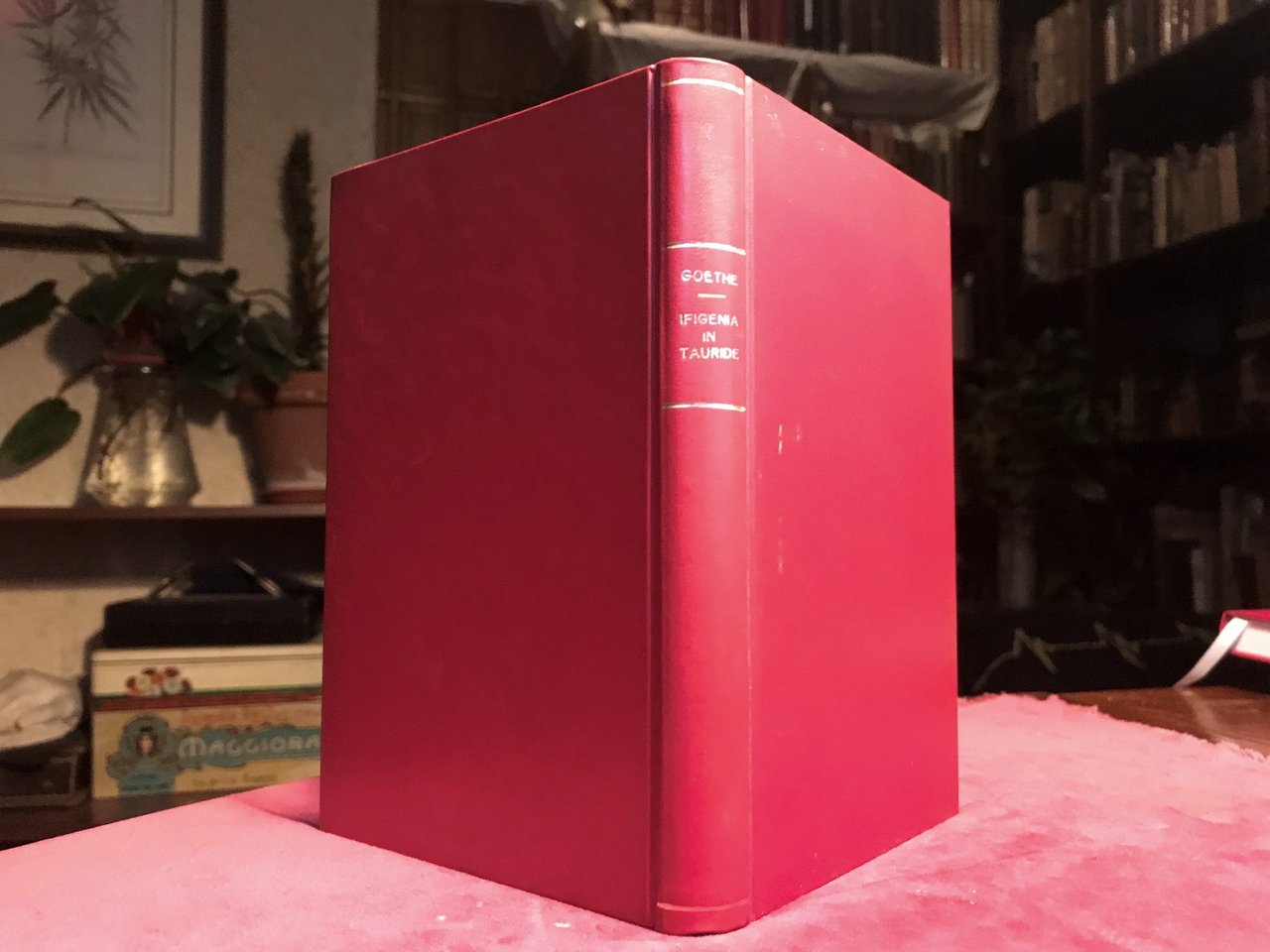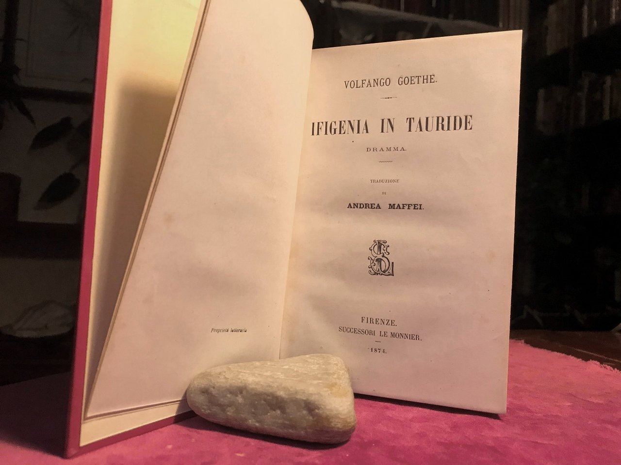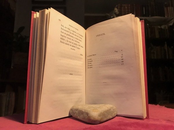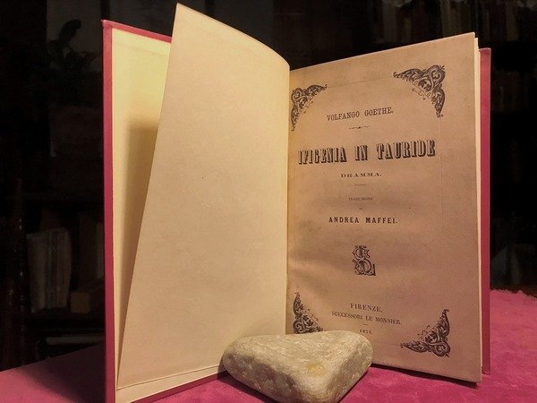 Volume in 8 legato in pelle, titolo al dorso, sguardie, antiporta occhiello, frontespizio, dedicatoria, 136 pp., indice, errata. Opera drammatica sulla vita ed i sentimenti di Ifigenia, travolta da atroci e lugubri situazioni rese ancora pi gotiche dal talento del grande scrittore. In bello stato.
