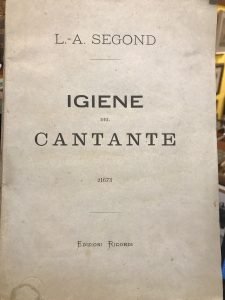 Influenza del canto sull'economia animale. Cause principali dell'infiacchimento della voce e dello sviluppamento di certe malattie nei cantanti. Mezzi di prevenire di queste malattie. Dall'indice: IMportanza del polmone, organi della voce, meccanismo della respirazione, meccanismo vocale ecc. Seconda edizione. Leggere fiortirue ad alcune pagine, piccolo strappo riparato al margine sup. del piatto post., ma buon esemplare. Pagg. 66,1. Brossura edit. Mis mm 300x205