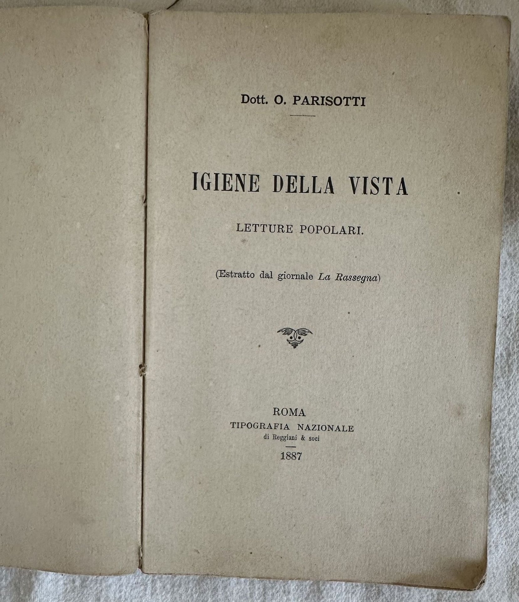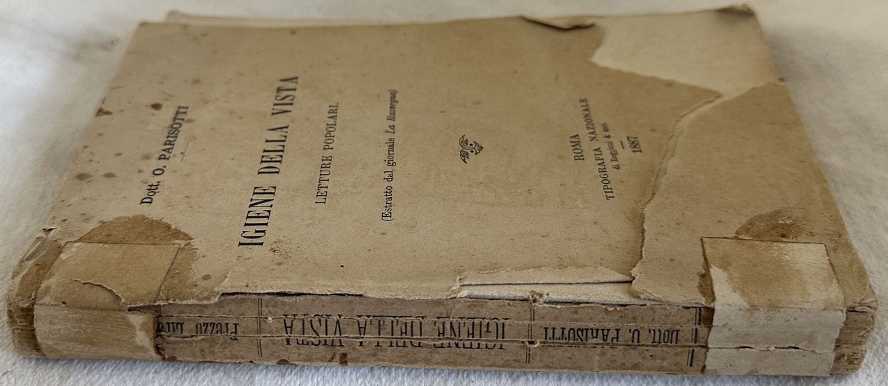 Rara monografia del 1887 sulla vista e le sue patologie del Dott. Parisotti. All'interno: Cause ereditarie della cecità; Igiene della vista nella prima infanzia; nella fanciullezza, nell'adolescenza e nella virilità, nella vecchiezza, Precetti di igiene comunia tutte le età (malattie infetive, dell'organismo, vestiti, vitto, aria, umidità, temperatura, luce, corpi estranei nell'occhio, denti, naso, traumi) ecc. In discrete condizioni. Copertina editoriale in mediocri condizioni generali con usure marginali. Piatto anteriore quasi del tutto staccato. Legatura in mediocri condizioni con rotture. Pagine in buone condizioni con fioriture. In 16. cm 18x11,5. Pp. (4)+214.