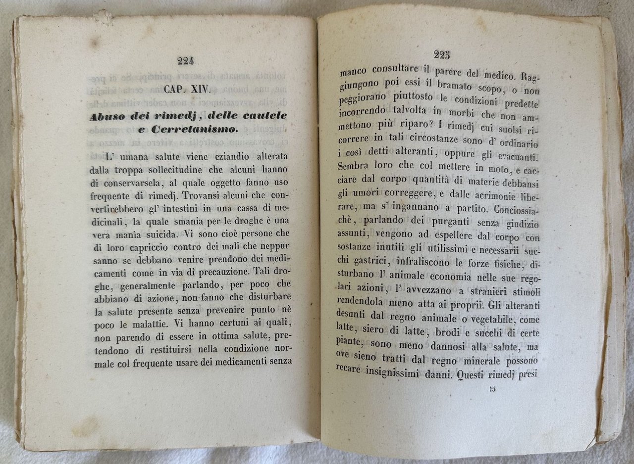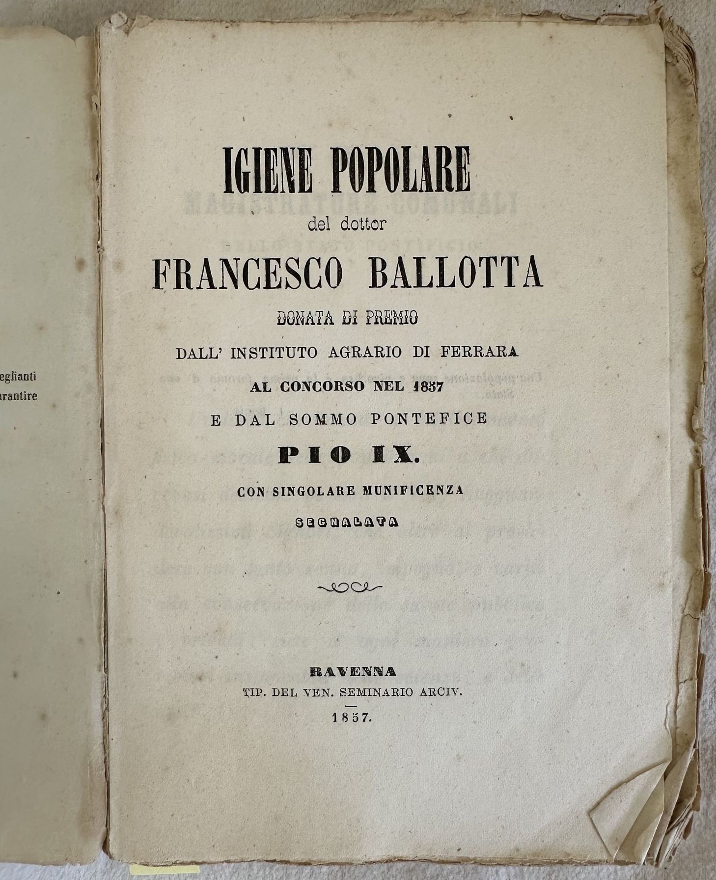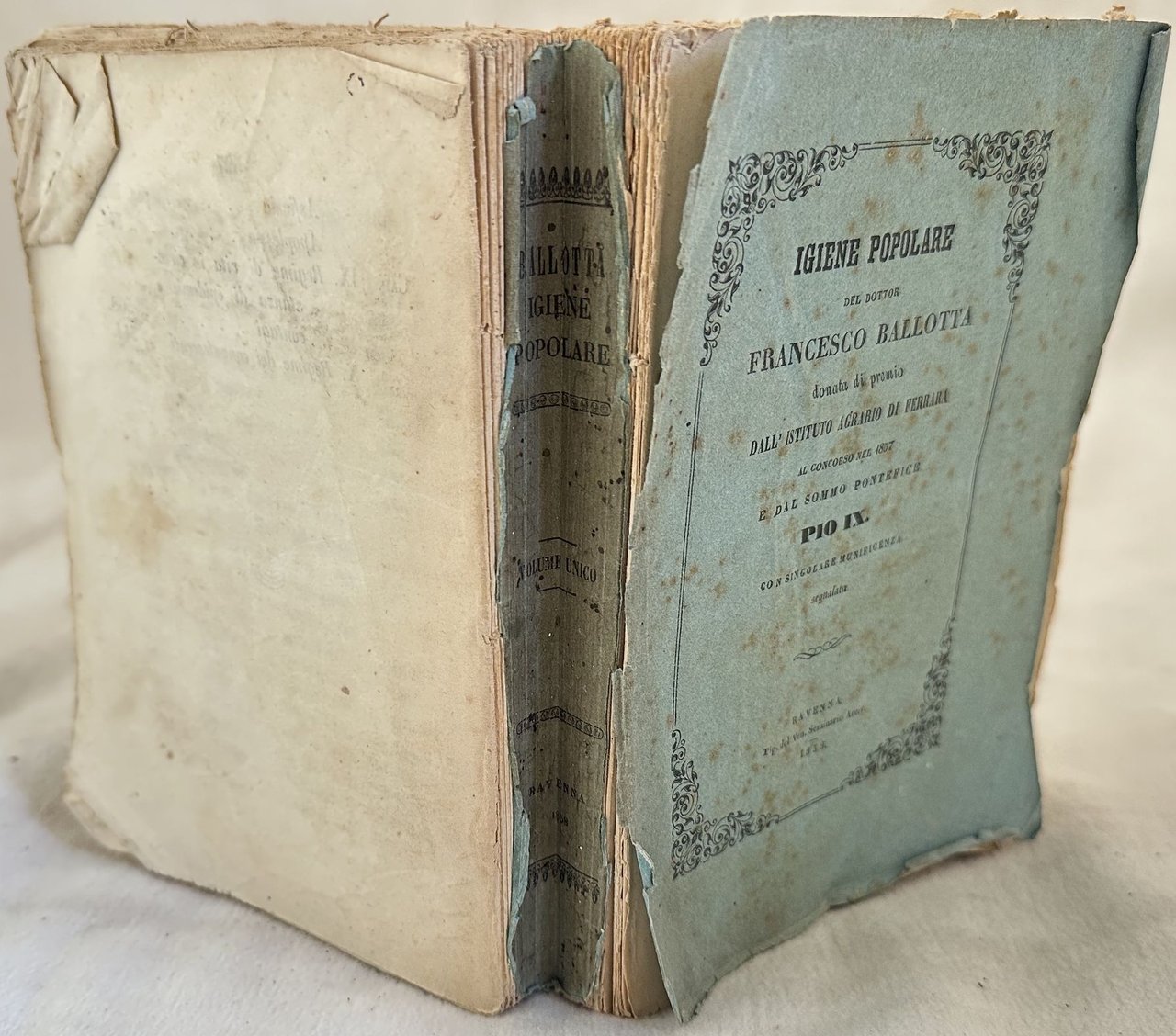 Edizione del 1857 di questo manuale di igiene popolare del Dottor Francesco Ballotta. Opera donata di premio dall'Istituto Agrario di Ferrara al concorso del 1857 e dal Sommo Pontefice Pio IX. All'interno: Sanità, matrimonio, abitudini, età, sesso, predisposizioni ereditarie, Igiene generale (aria stagioni abitazioni indumenti igiene personale, cibi, bevande, ritenzioni ed escrezioni, sonno, abuso dei rimesi dei riguardi e ciarlatanismo ec.), Igiene speciale (gravidanza puereperio e allattamento, vaccini, malattie in genere, malattie ereditarie principali, malattie più comune ad ambo i sessi non essenzialmente febbrili, infiammazioni, febbri, Malattie più ordinarie alle donne, Malattie più frequenti dei bambini, Soccorsi igienico terapeutici, REgime di vita in circostanza di epidemie e contagi, Regime dei convalescenti ecc. In discrete condizioni. Copertina editoriale in discrete condizioni con lievi usure marginali. Piatto posteriore assente. Legatura in discrete condizioni con rotture. Copertina e prima pagina staccata. Pagine in buone condizioni con rare fioriture. In 16. cm. 18x12,5. Pp. 527.Edition of 1857 of this manual of popular hygiene by Dottor Francesco Ballotta. Work given as a prize by Istituto Agrario di Ferrara in the concourse of 1857 by the Pope Pio IX. In fair conditions. Editorial cover in fair conditions lightly worn in the extremities. Back plate lacks. Binding in fair conditions with cracks. Cover and first page is detached. Pages in good conditions with occasional foxing. In 16. cm. 18x12,5. Pp. 527.