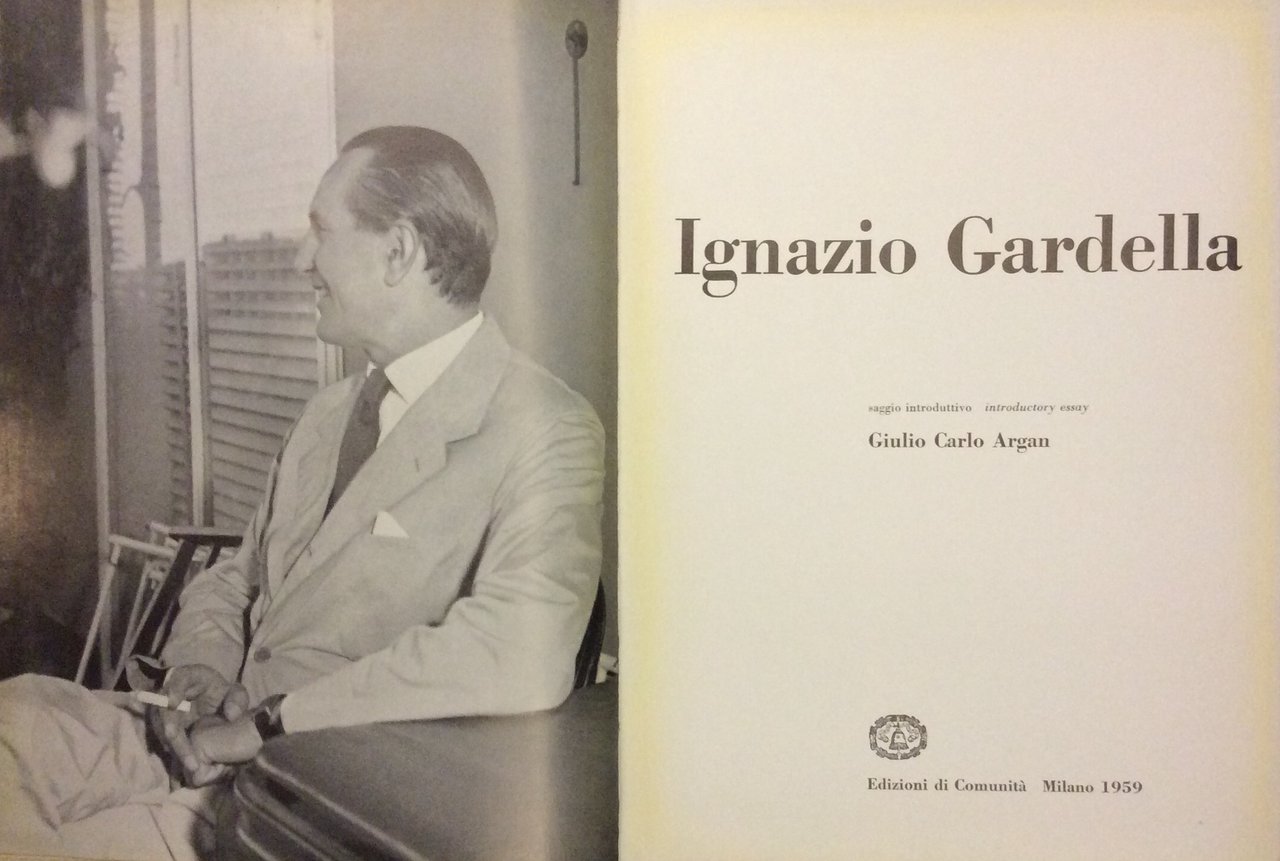 In-8 gr., tela editoriale, pp. 201,(3), con illustrazioni nel testo (foto e disegni), in bianco e nero e a colori. Testo in italiano e inglese. Monografia dedicata all'architetto Ignazio Gardella, che comprende la illustrazione di tutte le sue opere principali dal progetto per la Torre di Piazza del Duomo di Milano, del 1934, alla recentissima Mensa della Società Olivetti a Ivrea. Argan esamina criticamente l'opera di Gardella in un ampio saggio introduttivo. Ben conservato..