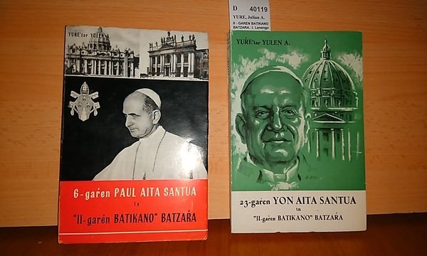YURE, Julian A. II - GAREN BATIKANO BATZARA. I. Lenengo aldia. 23-garen Yon Aita Santuak asi ta burutua. II. 2-Garen, 3-garen ta 4-garen aldiak. 6-garen Paul Aita Santuak yaraitu ta amaituak. Itxaropena. Zarautz 1965 2 vols. con 215+ 354 p. (18 cm) Rustica. El segundo vol. está impreso por Graficas ESET, de Vitoria. D (Ref.40119) vascuence euskera concilio vaticano ii