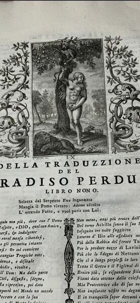 Splendido volume in-folio di pag. (8),96,143; l'antiporta del Piazzetta inc. a piena pag. dallo Zucchi precede l'elegante frontespizio con vignetta decorativa (mm. 85 x 100 ) e l'incisione di testata (mm. 155 x 120 ) all'ode dedicata ai Conti Gazola dallo stampatore Tumermani. Il testo, preceduto dalla vita del Milton (effegiato in pregevole vignetta), è superbamente stampato su carta pesante con ampi margini, a due colonne divise da graziosi fregi xilografici.L'opera è impreziosita da magnifiche testatine incise su rame all'inizio di ogni canto e 10 finalini di varia dimensione , Le 12 pregevoli inc. delle testate, ornate da bellissimi fregi barocchi, sono opera dello Zucchi, come d'altronde i finalini, e sono tratti da dipinti del Piazzetta, A.Mella Vero, Picard, S.Pinti, G.B.Crosati, G.B. Tiepolo, ecc.Notevole legatura veneziana coeva da amatore in piena pelle, piatti ornati da finissime inc. in oro a piccoli gigli: ai margini ed angoli dei piatti, la legatura è impreziosita da fregi a doppio filetto curvilineo racchiudente le iniziali del Poeta e dell'opera. Tutta la decorazione è inquadrata da finissima bordura a doppio filetto sottile e piccola ' dentelle'. Dorso a 5 nervi, due tasselli rosso scuro portano incisi in oro i tit. bordati da fregi ai piccoli ferri, tali in tutte le caselle.Uno dei più eleganti esemplari di figurato settecentesco. Copia freschissima e perfetta in legatura d'eccezione. I rari esemplari fin ora da me collazionati, sono tutti di misura ridotta a fronte di quello sopra descritto. Infatti l'antiporta del Piazzetta, legata al presente volume, è di ben 25 mm. più corta del testo: si deduce che l'esemplare in esame possa aver fatto parte di una piccola 'trance' di copie dedicate dall'autore a notabili dell'epoca, visti la dedica e lo straordinario tipo di legatura. c.r,f. - Maffei, n° 1739; Haym, n°1771; Gamba, n°1839, Graesse, 1859, IV, n° 530; Brunet, 1862, III. n 1731 orazzoni, anckoronska, nà 1950; Riva, 1979; Perosa, 1983; Pedrocco, 1986; Corubolo, 1987