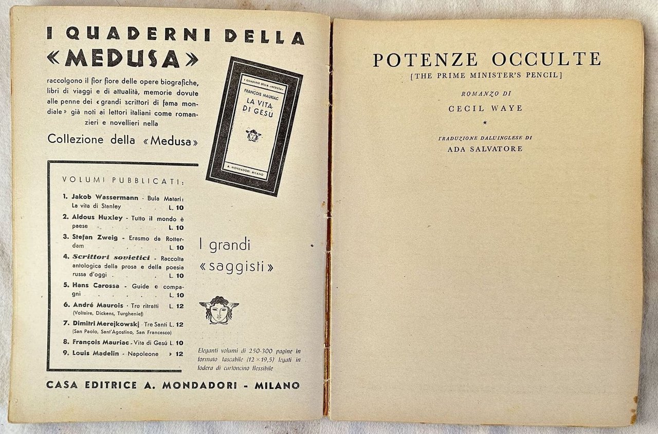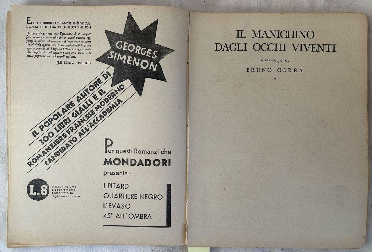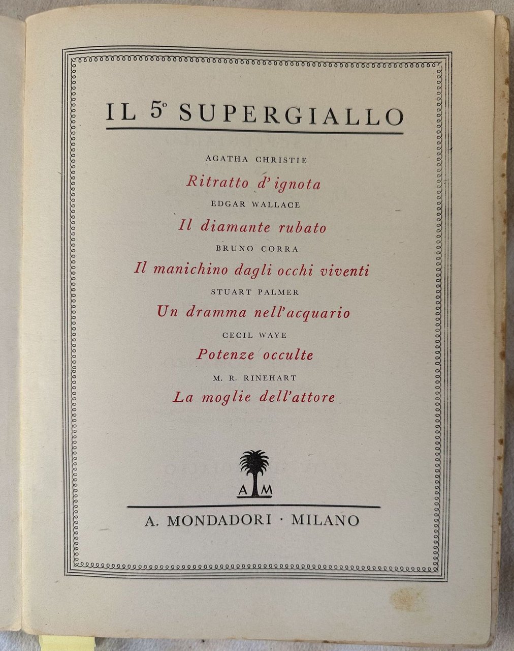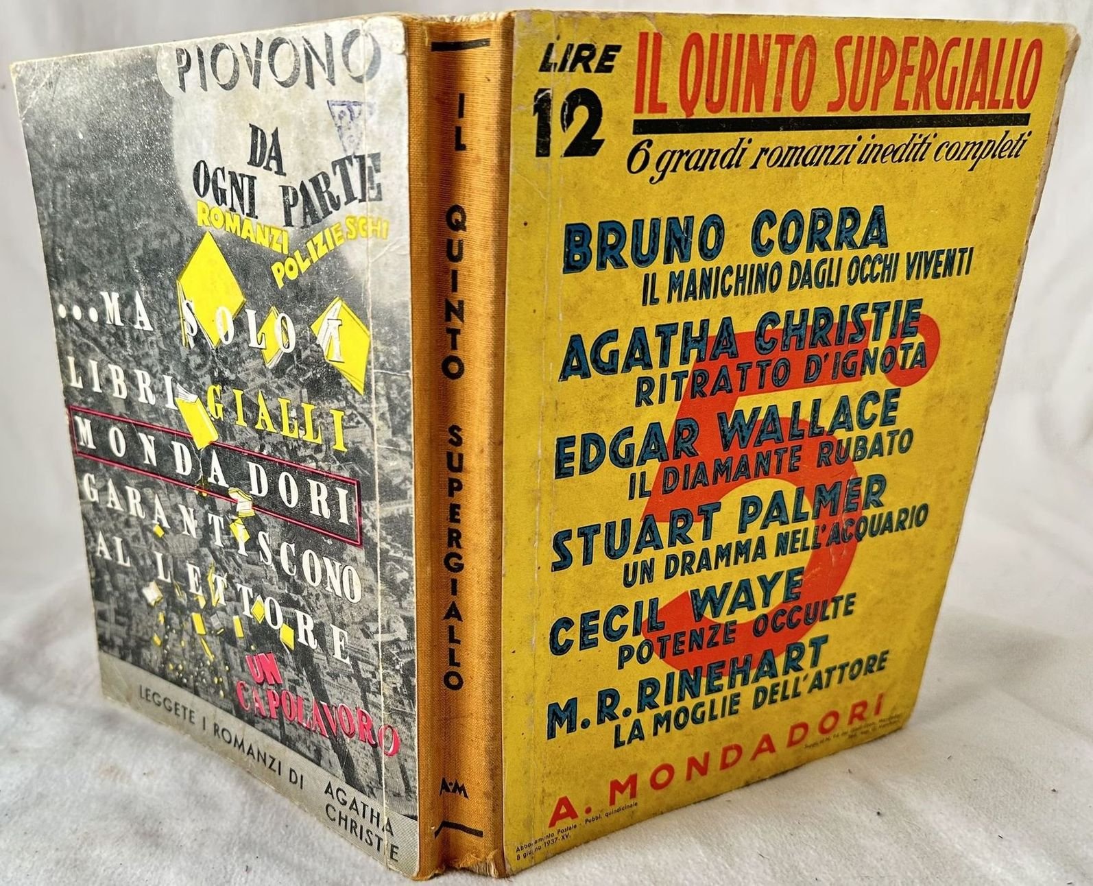 Edizione del 1937 di questa raccolta di romanzi gialli Mondadori della collana "Il quinto supergiallo" nella loro prima edizione italiana. All'interno: "Ritratto d'ignota" di Agata Christie; "Il diamante rubato" di Edgar Wallace; "Il manichino dagli occhi viventi" di Bruno Corra; Un dramma nell'acquario" di Stuart Palmer; "Potenze occulte" di Cecil Wave; "La moglie dell'attore" di M. R: Rineheart. In buone condizioni. Brossura editoriale in discrete condizioni con lievi usure marginali. Legatura in buone condizioni. All'interno le pagine si presentano in buone condizioni con rare fioriture. In 8. Dim. 24,5x18,5 cm. Pp. 94+33+54+70+89+52. Edition of 1937 of this collection of crime novels published by Mondadori in the series "Il quinto supergiallo" in their first italia edition. Inside: "Ritratto d'ignota" di Agata Christie; "Il diamante rubato" di Edgar Wallace; "Il manichino dagli occhi viventi" di Bruno Corra; Un dramma nell'acquario" di Stuart Palmer; "Potenze occulte" di Cecil Wave; "La moglie dell'attore" di M. R: Rineheart. In good conditions. Editorial cover in fair general conditions lightly worn in the extremities. Binding in good conditions. Inside pages are in good conditions with occasional foxing. In 8. Dim. 24,5x18,5 cm. Pp. 94+33+54+70+89+52.
