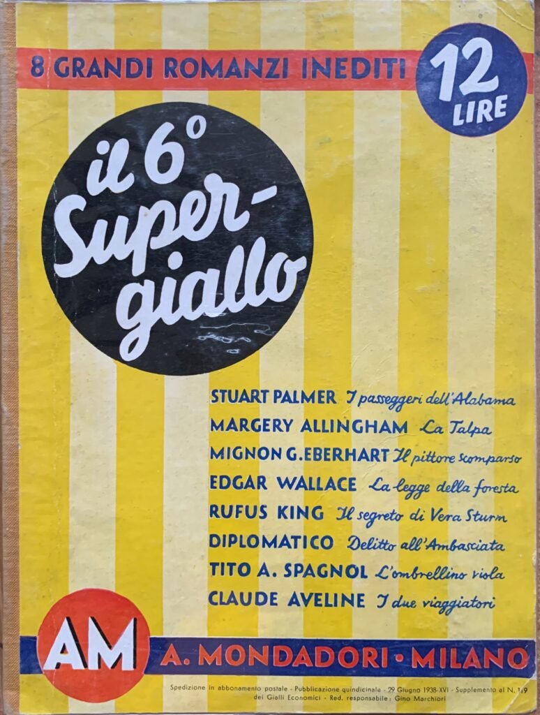 1^ edizione - Contiene 8 romanzi gialli: Stuart Palmer - I passeggeri dell'Alabama; Margery Allingham - La talpa; Mignon G. Eberhart - Il pittore scomparso; Edgar Wallace - La legge della foresta; Rufus King - Il segreto di Vera Sturm; Diplomatico - Delitto all'Ambasciata; Tito A. Spagnol - L'ombrellino viola; Claude Aveline - I due viaggiatori.
