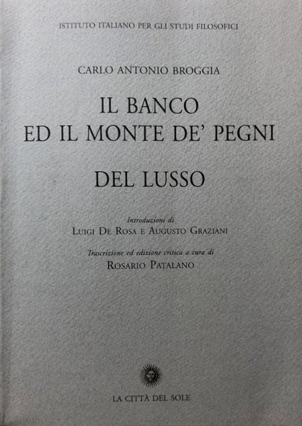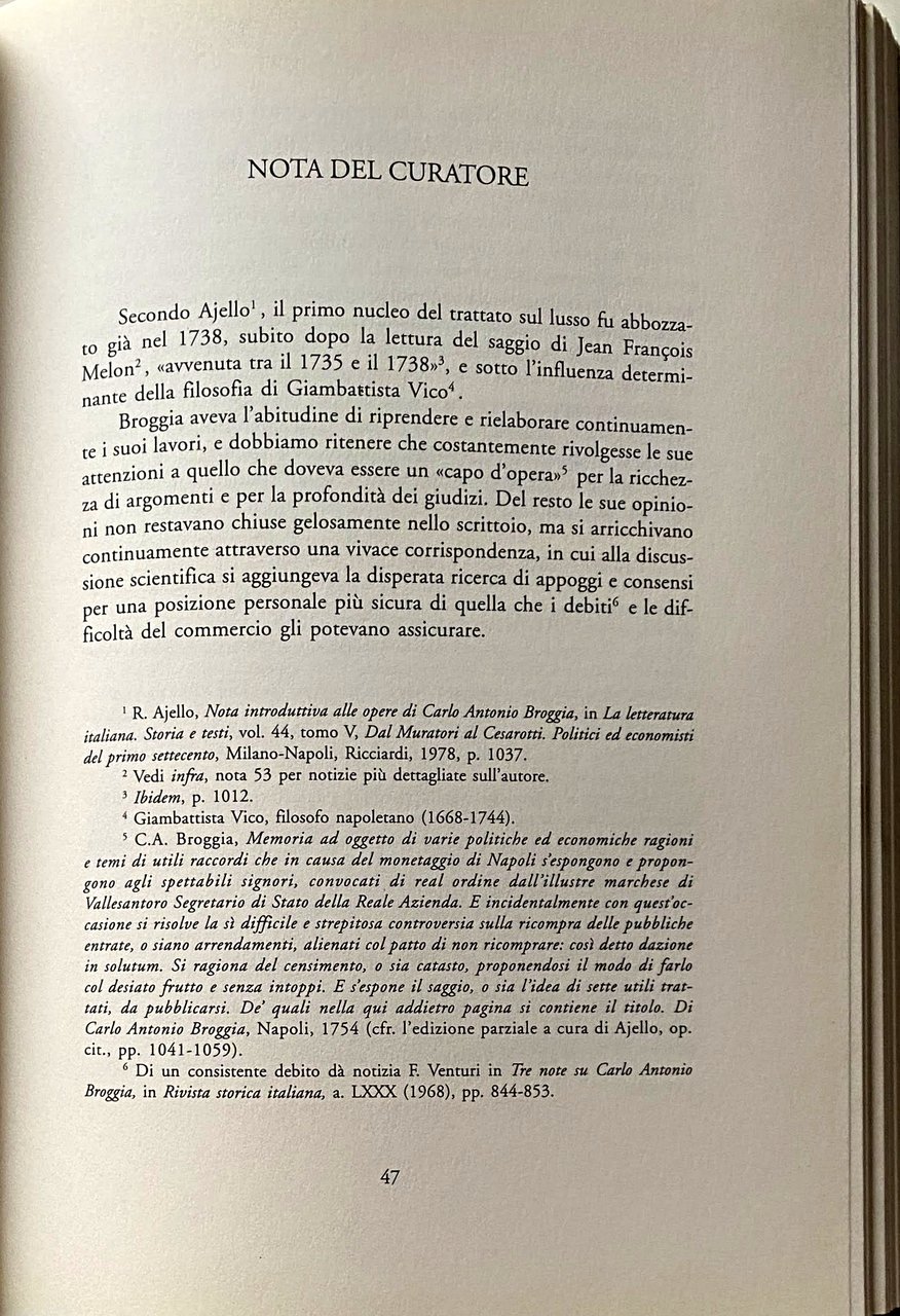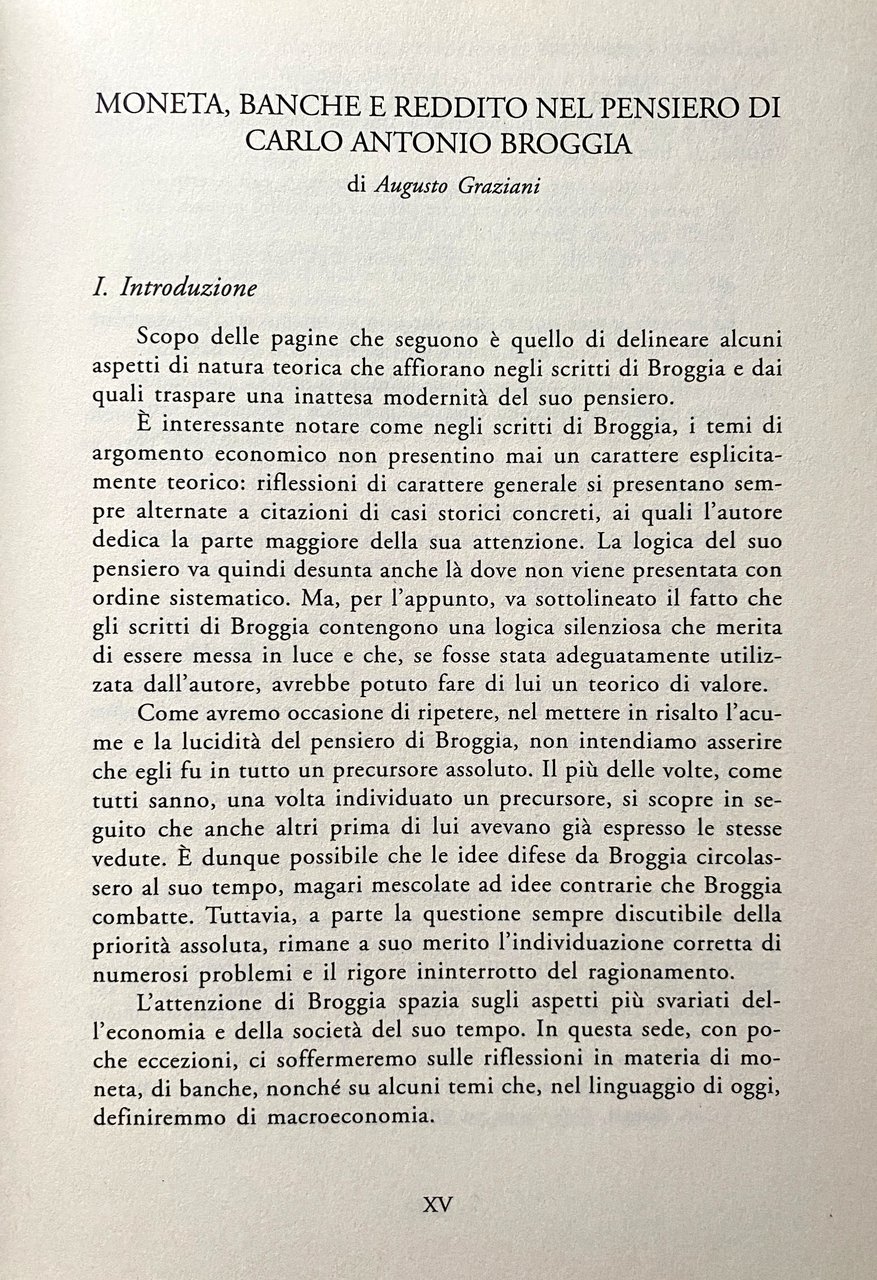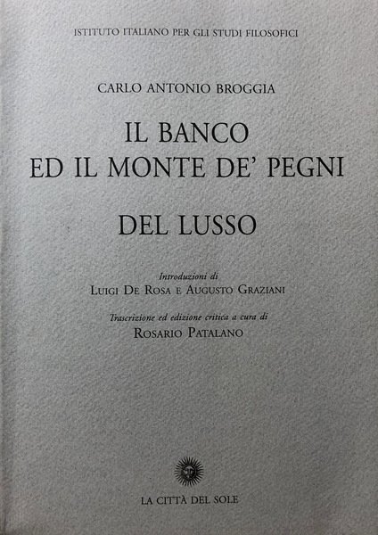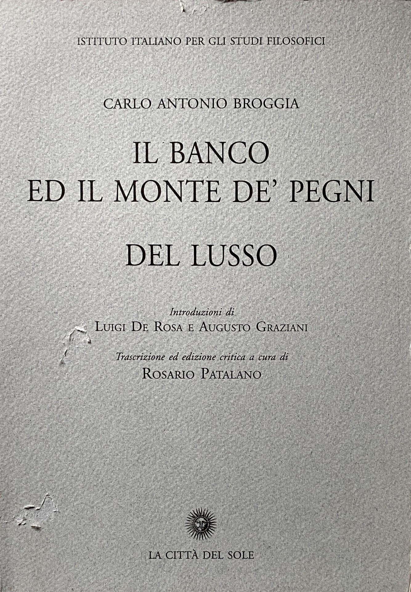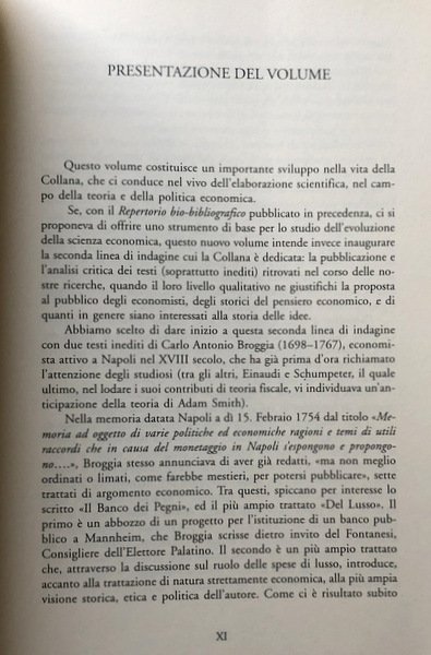 PRESENTAZIONE DEL VOLUME. Questo volume costituisce un importante sviluppo nella vita della Collana, che ci conduce nel vivo dell'elaborazione scientifica, nel campo della teoria e della politica economica. Se, con il Repertorio bio-bibliografico pubblicato in precedenza, ci si proponeva di offrire uno strumento di base per lo studio dell'evoluzione della scienza economica, questo nuovo volume intende invece inaugurare la seconda linea di indagine cui la Collana è dedicata: la pubblicazione e l'analisi critica dei testi (soprattutto inediti) ritrovati nel corso delle nostre ricerche, quando il loro livello qualitativo ne giustifichi la proposta al pubblico degli economisti, degli storici del pensiero economico, e di quanti in genere siano interessati alla storia delle idee. Abbiamo scelto di dare inizio a questa seconda linea di indagine con due testi inediti di Carlo Antonio Broggia (1698-1767), economista attivo a Napoli nel XVIII secolo, che ha già prima d'ora richiamato l'attenzione degli studiosi (tra gli altri, Einaudi e Schumpeter, il quale ultimo, nel lodare i suoi contributi di teoria fiscale, vi individuava un'anticipazione della teoria di Adam Smith). Nella memoria datata Napoli a dì 15. Febbraio 1754 dal titolo Memoria ad oggetto di varie politiche ed economiche ragioni e temi di utili raccordi che in causa del monetaggio in Napoli s'espongono e propongono., Broggia stesso annunciava di aver già redatti, ma non meglio ordinati o limati, come farebbe mestieri, per potersi pubblicare, sette trattati di argomento economico. Tra questi, spiccano per interesse lo scritto Il Banco dei Pegni, ed il più ampio trattato Del Lusso. Il primo è un abbozzo di un progetto per l'istituzione di un banco pubblico a Mannheim, che Broggia scrisse dietro invito del Fontanesi, Consigliere dell'Elettore Palatino. Il secondo è un più ampio trattato che, attraverso la discussione sul ruolo delle spese di lusso, introduce, accanto alla trattazione di natura strettamente economica, alla più ampia visione storica, etica e politica dell'autore. Come ci è risultato subito chiaro, si tratta di due opere di notevole livello scientifico, sia sul piano dell'analisi economica che su quello storico. Abbiamo chiesto a due illustri studiosi, Luigi De Rosa ed Augusto Graziani, di chiarire, nei rispettivi campi di competenza disciplinare, motivi d'interesse offerti da questi due scritti. Le loro due Introduzioni perfettamente complementari, ci forniscono le coordinate interpretative necessarie a comprendere il ragionamento broggiano. L'Introduzione di Graziani, di taglio analitico, illustra la rilevanza del pensiero economico di Broggia dal punto di vista della moderna teoria economica. Essa mette in evidenza come l'autore napoletano avesse sviluppato il modello di un'economia monetaria, trattando i temi dell'equilibrio macroeconomico in un'economia aperta, del ruolo della moneta e del credito bancario, della regolazione dei flussi finanziari, L'Introduzione di De Rosa, dopo aver ripercorso le precedenti tappe della riscoperta di Broggia come economista, ne inquadra il pensiero da un punto di vista storico, consentendoci di collocare lo scritto sul Lusso e quello sul Banco nel duplice contesto della biografia broggiana e della storia economica del Regno di Napoli, dalle cui vicende Broggia trasse la materia viva della sua elaborazione teorica. L'accurato e ricco apparato di note critiche allestito da Rosario Patalano, che è anche artefice delle trascrizioni, agevola la lettura dei testi, facilitando la collocazione delle due opere broggiane nel contesto della biografia intellettuale dell'autore, e corredandole con utili informazioni relative ad altri suoi scritti, ai nomi, ai luoghi. Molto poco rimane da aggiungere, se non qualche ragguaglio sul contesto di iniziative in cui si inserisce questa pubblicazione. I due inediti qui pubblicati sono parte della ricca raccolta di scritti di Broggia, custodita presso la Biblioteca Nazionale di Napoli, al cui Direttore, Mauro Giancaspro, porgiamo i nostri vivi ringraziamenti per la collaborazione e l'interesse mostrato per il nostro lavoro. Antonio Allocati, allora direttore dell'Archivio di Stato di Napoli, aveva scoperto l'intero giacimento di scritti broggiani negli anni 50, e ne aveva pubblicati alcuni. Allocati stesso eseguì la trascrizione di molti di questi scritti, che poi incluse (insieme alle trascrizioni di altri manoscritti di Broggia conservati a Palermo), in un fondo che egli stesso mi affidò pochi anni prima di morire. Tale fondo, cui abbiamo dato il nome Allocati-Broggia, è oggi custodito presso la Biblioteca del Dipartimento di Scienze Economiche.