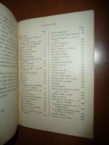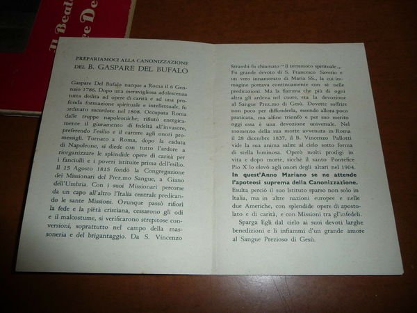 DESCRIZIONE: Ed. Missionari del Preziosissimo Sangue, Roma, 1949. In 16°, br. ed. ill. a col., pp. 157 con numerose ill. e foto b/n n.t. Gaspare del Bufalo (Roma, 6 gennaio 1786 – Roma, 28 dicembre 1837) è stato un sacerdote italiano, fondatore della congregazione dei Missionari del Preziosissimo Sangue; beatificato nel 1904 da papa Pio X, è stato proclamato santo da papa Pio XII nel 1954. CONDIZIONI: Ottime. PESO / WEIGHT: 150 gr. without package