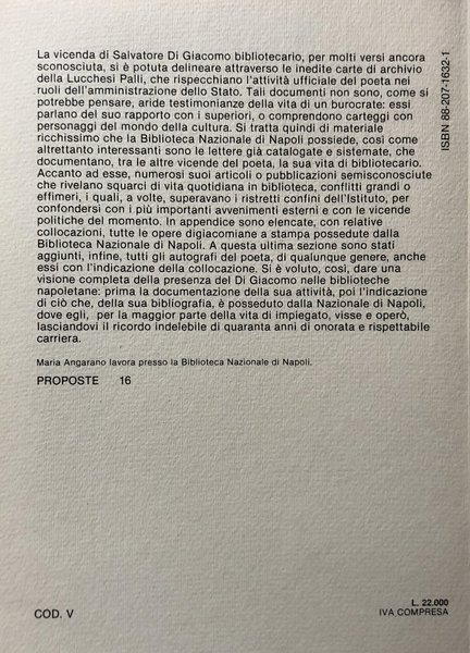 Soggetti: Studi letterari, Storia e critica della letteratura, Poesia, Poeti napoletani, Cronache, Biografie, Aneddoti, Libri Vintage, Libri Fuori catalogo, Linguistica, Filologia, Salvatore Di Giacomo, Attività di bibliotecario, Biblioteconomia, Cultura, Scienza dell'informazione, Manoscritti, Lettere, Lucchesi- Palli, Carteggio, Cronologia, Esperienze, Conservatorio, Impiegati, Lavori, Professioni, Uomini illustri, Archivio, Majella, Zara Giuseppe Sabalich, Stampa, Editoria, Burocrati statali, Pubblicazioni, Amministrazione, Articoli, Carriera, Bibliografia, Literary studies, History and criticism of literature, Poetry, Neapolitan poets, Chronicles, Biographies, Anecdotes, Out of print books, Linguistics, Philology, Librarian activity, Librarianship, Culture, Information science, Manuscripts, Letters, Library, Correspondence, Chronology , Experiences, Conservatory, Employees, Jobs, Professions, Illustrious men, Archives, Press, Publishing, State bureaucrats, Publications, Administration, Articles, Career, Bibliography