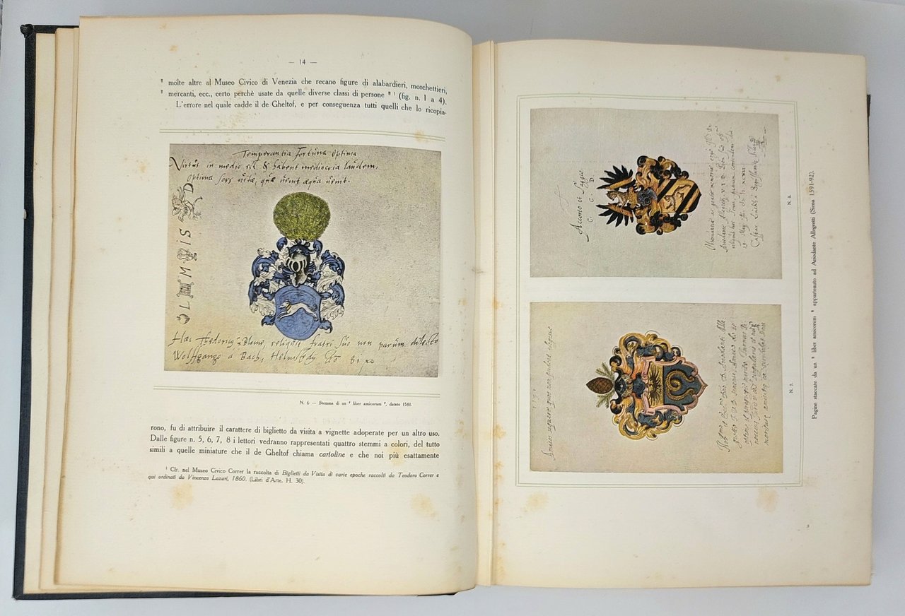 >in-folio, pp. 215 di testo, 676 figure di biglietti da visita applicati su cartoncino e numerati, di cui 80 riprodotte dagli originali in litografia o calcografia, in nero e a colori. Antiporta figurato protetto da velina. Solida legatura editoriale in tela blu, figurata e titolata in oro. Magnifica opera storico-artistica sul biglietto da visita, impressa su carta forte. Prima edizione. Buon esemplare, minime fioriture (più estese sul frontespizio).