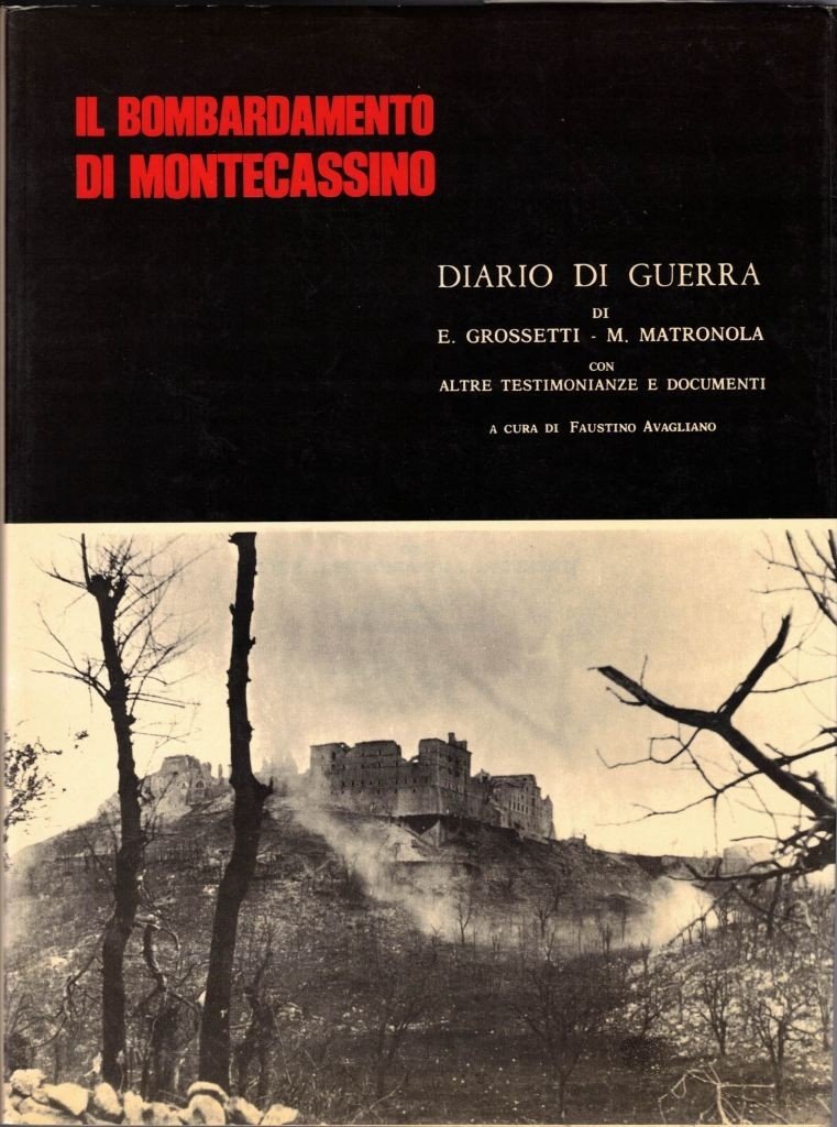 Il bombardamento di Montecassino. Diario di guerra, di E. Grossetti e M. Matronola. Con altre testimonianze e documenti, a cura di Faustino Avagliano, s.n., Montecassino 1980, pp. 286, 40 c. di tavv. f.t. ill. b.n., cm 26, br. ed. con sovraccoperta. Collana Miscellanea Cassinese, a cura dei Monaci di Montecassino, vol. 41. Stampa: Tipografia Editrice M. Pisani (Isola del Liri). Indice: Presentazione – Diario di guerra di E. Grossetti e M. Matronola – Diario di T. Leccisotti – Relazione sugli avvenimenti svoltisi nella badia di Montecassino (settembre-ottobre 1943) – Memorie di guerra di Fulvio de Angelis, Annotazioni di Armando Carotenuto – Appendice (Lettere – Relazioni dell’Abate Rea alla Segreteria di Stato – Documenti riguardanti il deposito di S. Gennaro – Opere d’arte nella bufera. Il salvataggio del medagliere di Siracusa – Come fu salvato il quadro della Madonna della distrutta chiesa di Montecassino – Il mio rischio a Montecassino. Il salvamento degl’insostituibili tesori d’arte dell’abbazia benedettina di Giulio Schlegel) – Indice. Ottimo.