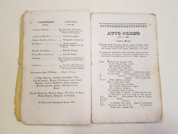 Cm. 19 x 11,5; pp. 36; brossura editoriale sciolta in carta leggera (conservato il solo piatto anteriore, con arricciature e strappetti).<BR>Con i nomi degli esecutori: Giovanni Mitrowich, Angelo Calderini, Raimondo Castigliano, Antonio Poggi, Cesare Castelli, Luigi Loriani, Benedetta Colleoni Corti, Marianna Barbieri - Nini<BR>CONDIZIONI ACCETTABILI: perdita del dorso; legatura lenta; strappetti con piccole perdite all'ultima pagina; strappettini e margini piegati al piatto anteriore