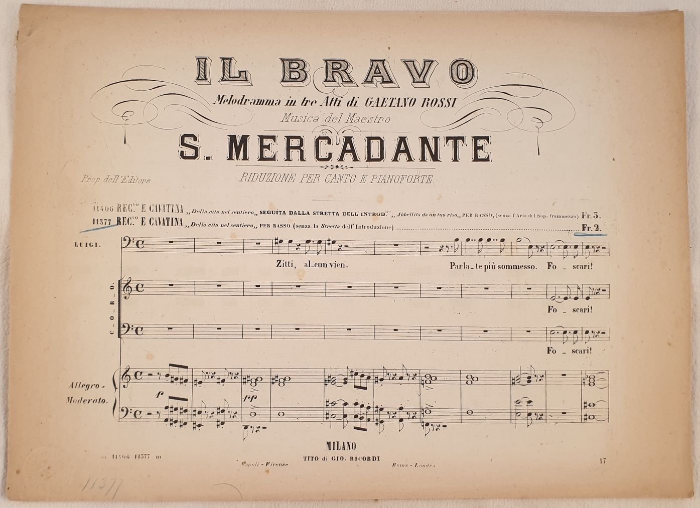 Edizione Ricordi del novembre 1878 di questo spartito per pianoforte e canto per basso della melodia 11377 "Rec. e cavatina Della vita nel sentiero per Basso" dall'opera "Il bravo" di Saverio Mercadante. Risulta mancante la partitura 11406 In ottime condizioni con fioriture. Copertina assente. Legatura editorialmente assente. Completo di tutte le pagine. Formato album. cm. 25x34,5. Pp. 9.Ricordi edition of november 1878 of this musical score for piano and chant for basso of the melody 11377 "Rec. e cavatina Della vita nel sentiero per Basso" from the work "Il bravo" by Saverio Mercadante. Musical score 11406 is missing. In very good conditions, with foxings. Cover is missing. Plates are almost disbound. Binding is editoriarly loss. Complete of all pages. Formato album. cm. 25x34,5. Pp. 9.<BR><BR>