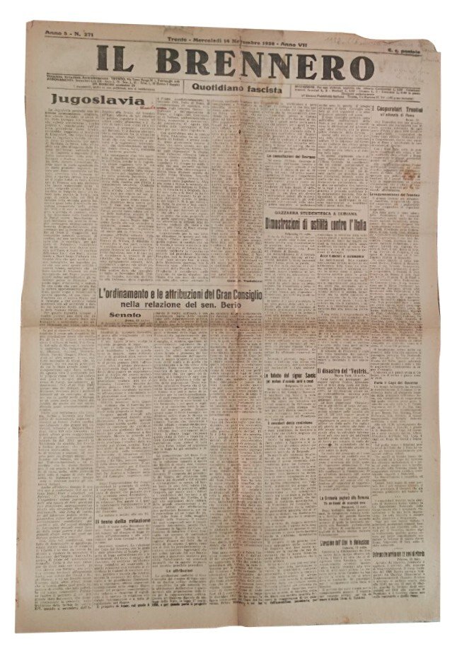 Folio, mm. 600x425. Pubblicazione anno 5, n. 271 del quotidiano fascista 'Il brennero'. Testo fronte e retro. C. lievemente brunita, piccoli strappi alle piegature centrali. In generale, buono stato di conservazione.