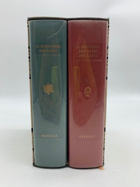 2 volumi in 16, cm. 13 x 20, pp. 1207 + (1); 1162 + (2). Legature editoriali rispettivamente in similpelle verde e rossa con fregi e titoli incisi in oro ai piatti e ai dorsi, sovraccoperte in acetato trasparente. Cofanetto cartonato con titoli e decorazioni ai piatti al dorso. In ottimo stato. Raccolta antologica di brani che hanno l'intento di elevare la condizione morale; si alternano poesie e scritti in prosa di autori italiani e stranieri d'ogni tempo. Trovano spazio mistici (Sant'Agostino, Sant'Ambrogio, San Basilio, Gotama Buddha, Santa Caterina da Siena, San Gerolamo, Sant'Ignazio di Loyola, San Francesco di Sales, San Filippo Neri, San Tommaso d'Aquino), filosofi (Cicerone, Catullo, Callimaco, Orazio, Ovidio, Plutarco, Seneca, Senofonte, Tertulliano) scrittori, poeti, drammaturghi, artisti e non solo (Lorenzo De' Medici, Lope de Vega, Dostoievskij, Eliot, Fogazzaro, Foscolo, Anna Frank, Galileo Galilei, Goethe, Gogol, Gozzano, Hesse, Hugo, Irving, Joyce, Leonardo da Vinci, Leopardi, Lincoln, Melville, Metastasio, Ada Negri, Papini, Pascoli, Pasternak, Proust, Ramuz, Rostand, Rousseau, Tagore, Tolstoi, Vittoria Colonna, Benedetto Croce, Honore' de Balzac, Bertrand, Blake, Byron, e moltissimi altri).
