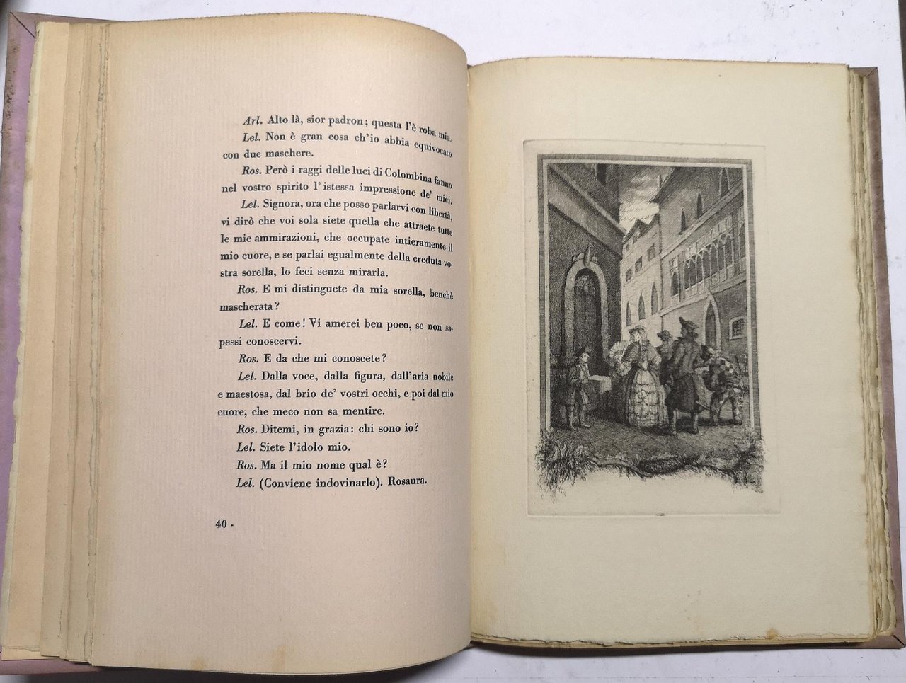 >in-8 grande, pp. 151, (5), frontespizio inciso all'acquaforte e 10 acqueforti f.t.; cart. edit. con sovraccoperta incamiciata figurata. Edizione di 100 esemplari, le incisioni sono di Emanuele De Giorgio, alunno del II anno di Perfezionamento della sezione di Calcografia dell'Istituto. Buon esemplare, in barbe (ma coperta con difetti).