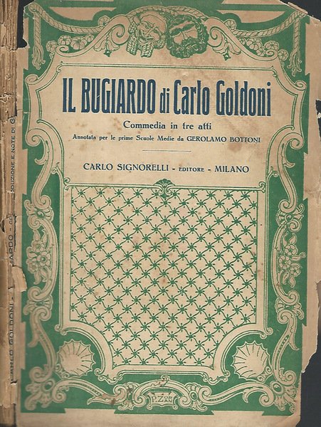Commedia annotata per le scuole media da Girolamo Bottoni. Brossura in cartoncino illustrata, consumata e scurita dal tempo, con piatto posteriore distaccato, margini sfilacciati e diverse piccole mancanze al dorso, con titoli poco leggibili ed ai piatti e con alcune fioriture. Pagine ingiallite, non rifilate, con fioriture sparse e legatura allentata in più parti. Numero Pagine 80