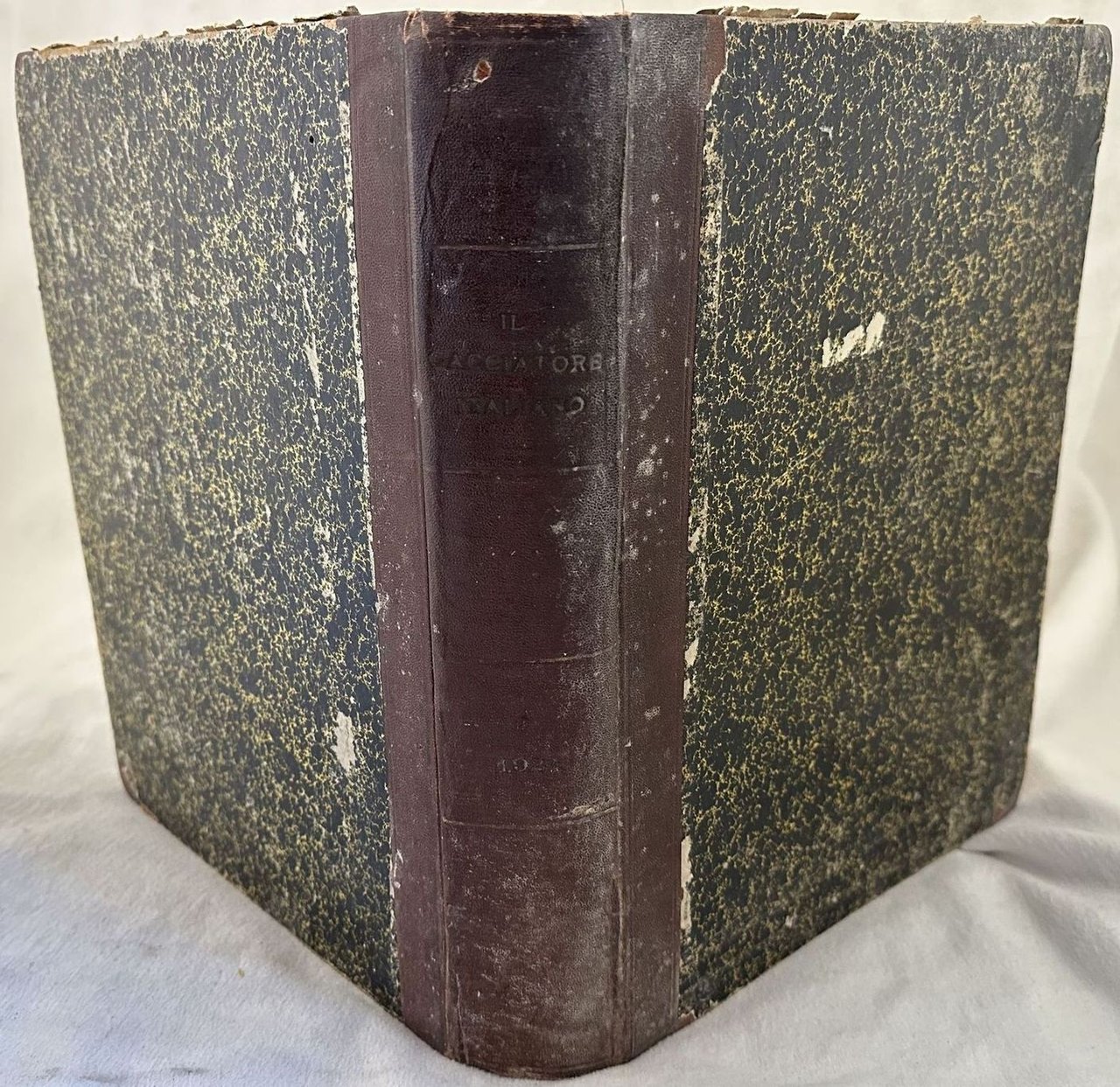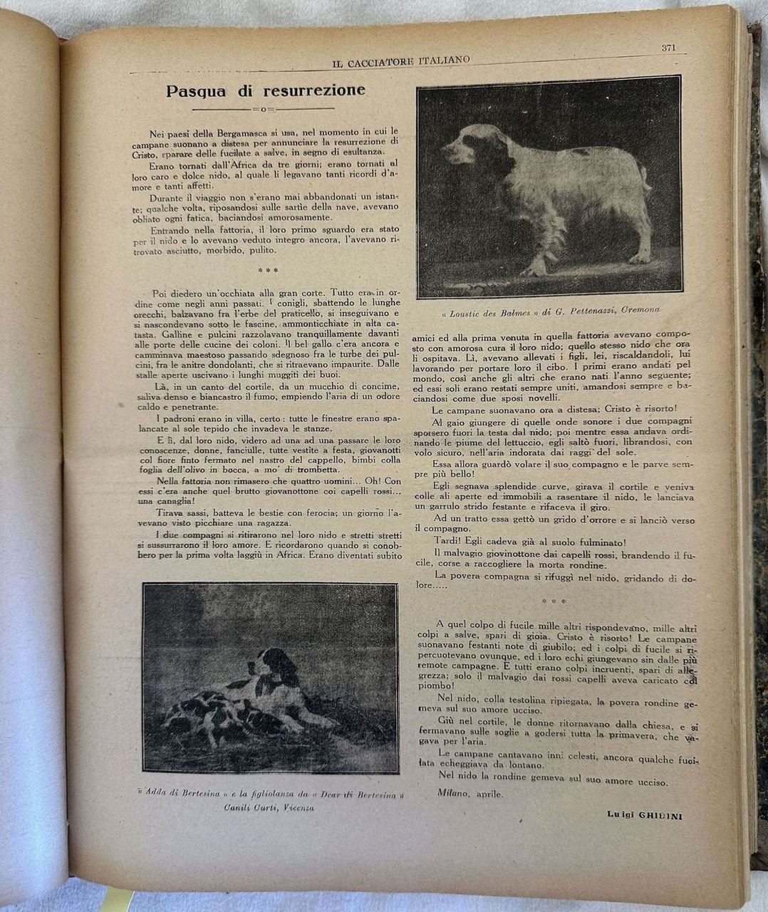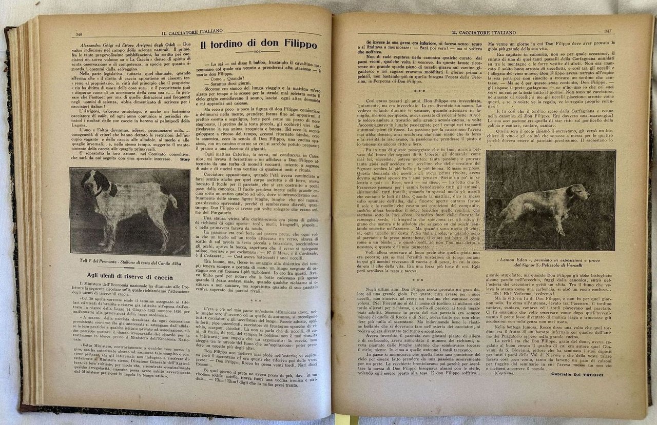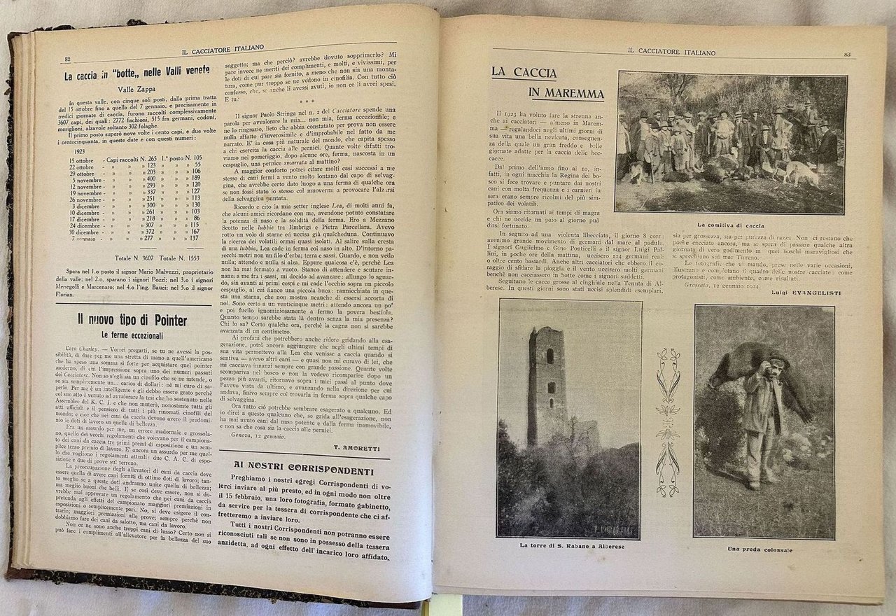 Annata completa del 1924 della rivista "Il cacciatore italiano". La raccolta comprende 52 numeri completi di brossura editoriale. Tra gli articoli presenti: Cacciata alle starne; L'occhio del cane; La caccia in "botte" nelle valli venete; La consulenza del "Cacciatore", Banco di prova di Brescia; L'anticipo della chiusura della caccia in provincia di Alessandria; La caccia in tempo di neve; La tradizionale partita di caccia alla lepre (Brioni Istria); I cacciatori e la pesca; La caccia in Liguria; Trasporto dei cani in ferrovia; Una cacciata a lepri nel Veneto; Le restrizioni alla caccia in Sardegna; La cacia in botte nelle valli bolognesi; La caccia in Maremma; Il nuovo tipo di Pointer; Braconaggio; La caccia sulla Riviera Adriatica, La situazione venatoria in Lomellina, Braconaggio a Lucca, Esposizione canina di MAntova, La caccia alle Marzaiole nel Leccese, La mostra canina a Verona, Venezia, Genova, Mantova, Napoli; Canile delle SAntelle di Pisa; La pesca sul Lago Maggiore, Il bracco pesante; Nel Parco Regonalee di Abruzzo; I nomi dialettali lombardi della selvaggina; In difesa della pernice sarda; Giacomo Puccini cacciatore; A caccia del camoscio in Valtellina ecc. Presente inoltre Cronaca venatoria: (Alessandria, Toscana, Lazio, Brescia, Varese, Genova), Consulti veterinari e ricette di selvaggina. In buone condizioni. Copertina in mezza tela in buone condizioni generali con lievi usure ai margini e dorso. Legatura in buone condizioni generali. Pagine in buone condizioni generali con rare fioriture e mende. Qualche piccolo strappo. In folio. Dim. 32,5x27 cm. Pp. 1244+(2). Peso Kg. 3,400<BR><BR> <BR><BR>
