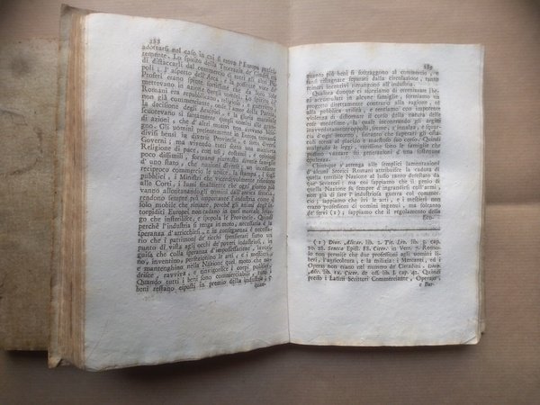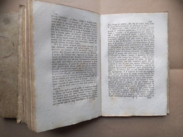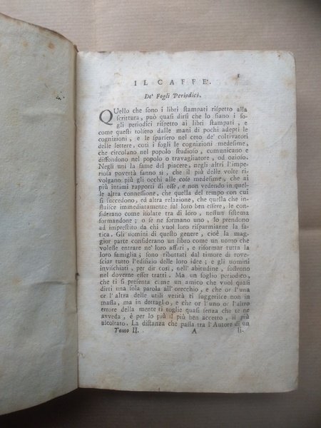 Seconda edizione. Dal giugno 1764 a tutto maggio 1766. (Tutto il pubblicato). -Due volumi in 8° di VIII-517pp; 523pp. Mancano fin dalla rilegatura pagine di titolo e sommario del vol. 2 (una segnatura, VIII pp), che comincia con pag.1. Brossura lucida del tempo, minime usure. -Seconda e sempre rara edizione in volume del Caffé, il più famoso periodico illuminista italiano, animato dai fratelli Verri e da Beccaria. La prima raccolta era apparsa in 4to a Brescia, pochi mesi prima. Numerosi gli articoli di interesse economico: Elementi del Commercio; Considerazioni sul Lusso; Sul Commercio della Nobiltà (che si inserisce nella polemica sollevata dalla Noblesse Commerçante del Coyer), Tentativo analitico sui Contrabbandi, ecc.