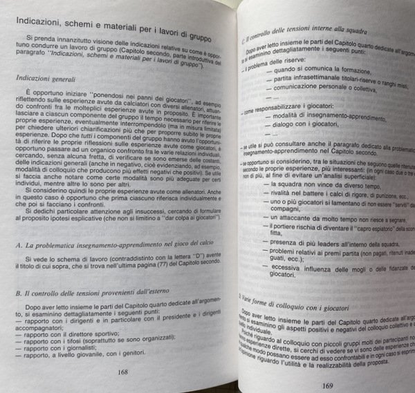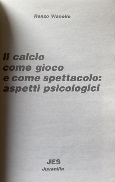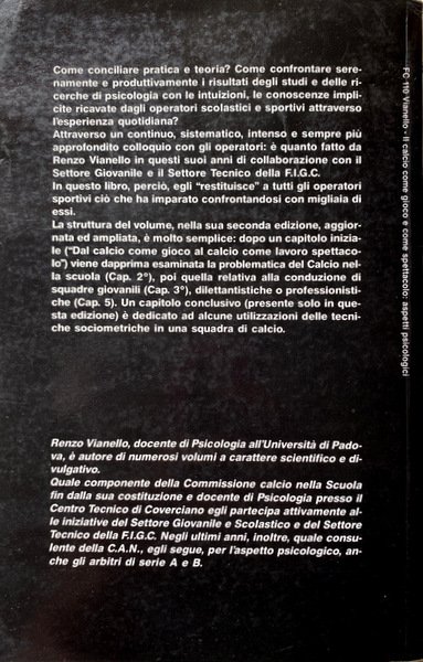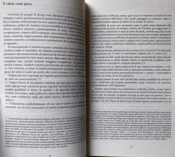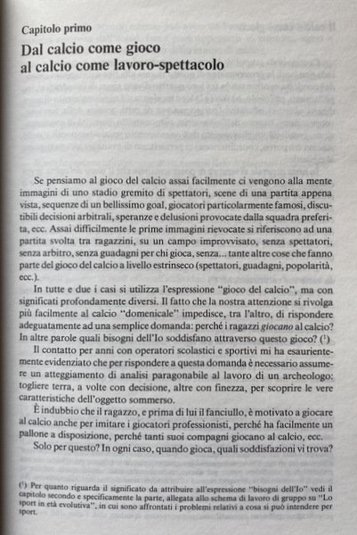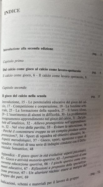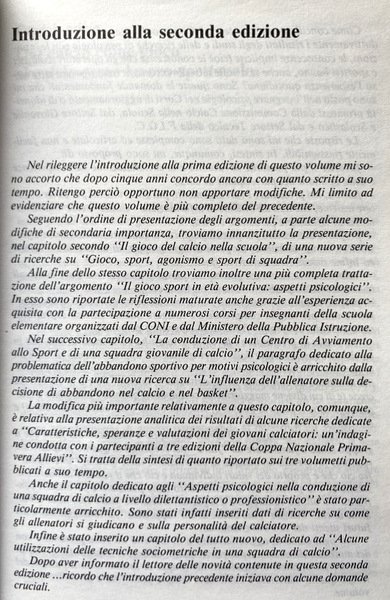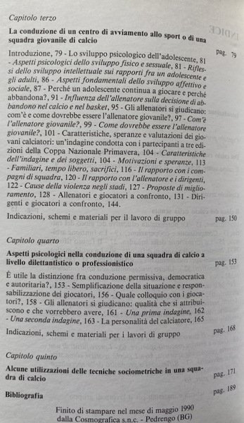 Soggetti: Sport, Calcio, Giochi con la palla, Esperienze, Studi, Ricerche, Psicologia dello sviluppo, Operatori scolastici e sportivi, Principi psicologici, Arbitri, Federazione, CONI, Insegnamento, Bambini, Tornei, Gare, Partite, Squadre giovanili, Club, Socializzazione, Allenamento, Competizione, Attaccanti, Difensori, Tattica, Tecnica, Portieri, Serie A e B, Scuole, Giovani, Ragazzi, Dilettanti, Professionisti, Sociometria, Squadra, Allenatore, Socializzazione, Allievi, Teoria, Pratica, Età evolutiva, Crescita, Stadio, Goal, Rispetto, Avversario, Autocontrollo, Disciplina, Coordinazione, Educazione fisica motoria, Ruoli, Lavoro, Spettacolo, Agonismo, Prestazioni, Schemi, Specializzazione precoce, Adolescenti, Famiglia, Carisma, Tempo libero, Coppa Nazionale Primavera, Formazioni, Mister, Arbitraggio, Abbandono, Basket, Rugby, Violenza, Dirigenti, Tifosi, Personalità, Indagini, Studi, Riferimento, Bibliografia, Piaget, Pagnin, Antonelli, Cesa Bianchi, Lewin, Risultati, Sociogramma, Responsabilità, Lavoro di gruppo, Pedagogia, Riserve, Genitori, Sports, Football, Ball games, Experiences, Studies, Research, Developmental psychology, School and sports operators, Psychological principles, Referees, Federation, Teaching, Children, Tournaments, Competitions, Matches, Youth teams, Socialization, Training, Competition, Attackers, Defenders, Tactics, Technique, Goalkeepers, Schools, Youth, Boys, Amateurs, Professionals, Sociometry, Team, Coach, Socialization, Students, Theory, Practice, Developmental age, Growth, Stadium, Respect, Opponent, Self-control, Discipline, Coordination, Motor physical education, Roles, Work, Entertainment, Competition, Performance, Schemes, Early specialization, Teenagers, Family, Charisma, Leisure, National Spring Cup, Formations, Refereeing, Abandonment, Violence, Executives, Fans, Personality, Surveys, Reference, Bibliography, Results, Sociogram, Responsibility, Teamwork, Pedagogy, Reserves, Parents, Libri Vintage Fuori catalogo, Out of print Books
