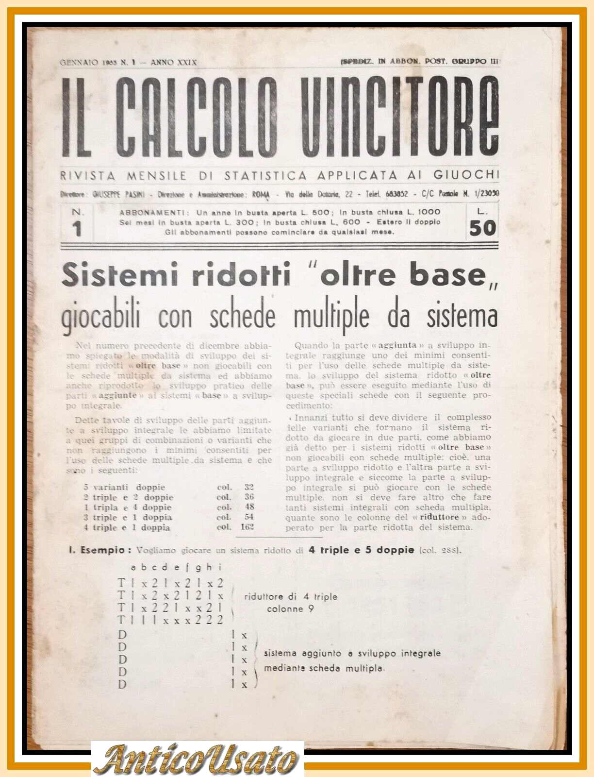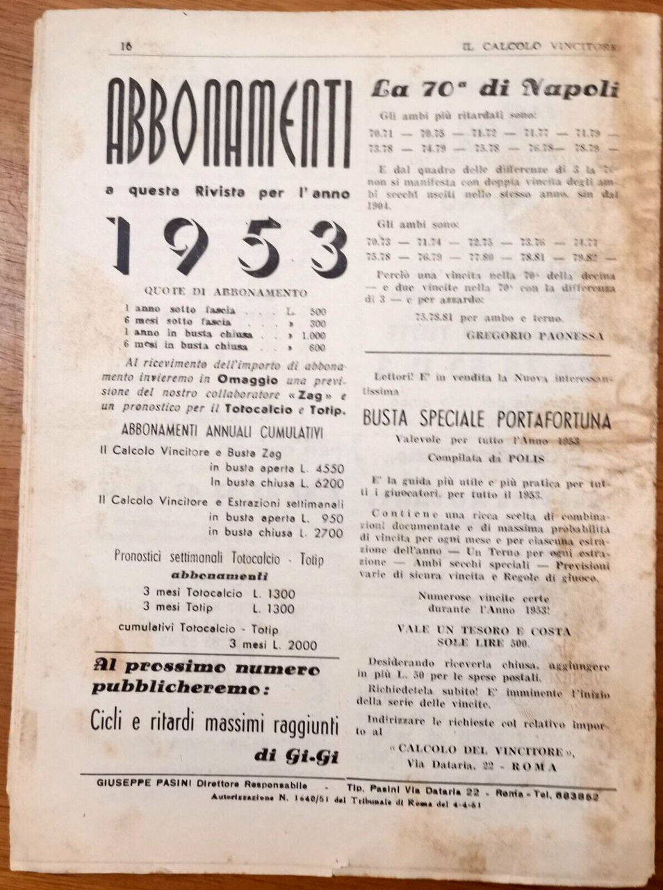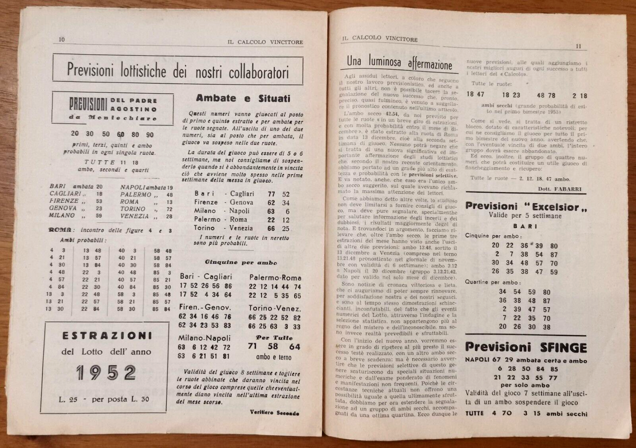IL CALCOLO VINCITORE rivista di statistica applicata ai giochi Lotto 1953 numeri