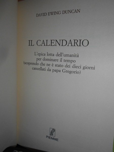 David Ewing Duncan. Casale Monferrato, Edizioni Piemme, 1999. Il Calendario. L' epica lotta dell' umanità per dominare il tempo (scoprendo che ne è stato dei dieci giorni cancellati da papa Gregorio). In-8°, cartonato edit. con sovracopertina. 352 pp. con alcune illustrazioni nel testo. In ottimo stato di conservazione. Neg. mob. nuovo