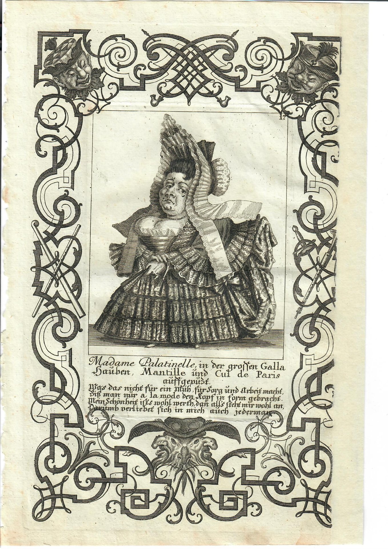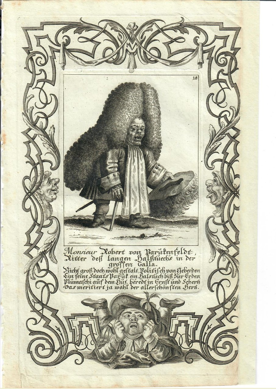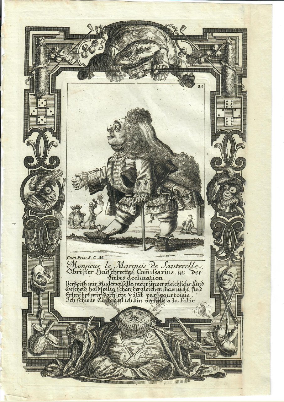 >Incisioni in rame (mm 300x200 compresi i margini) di J. Folkema ed altri artistidai disegni di G. Koning. Raffigurazioni grottesche e satiriche di professioni, vizi e caratteri tipici della commedia dell'arte. In calce, in carattere corsivo e gotico, seguono la descrizione del personaggio e 4 versi in tedesco, fiammingo, francese o italiano. Ogni incisione è racchiusa entro stupende bordure grottesche con figure, lungo il cui lato inferiore si sviluppa una scenetta con altre caratterizzazioni satiriche. Stupende incisioni tratta dalla rara serie pubblicata ad Amsterdam nel 1715 con il titolo "Le mond plein de fols ou le theatre des nains". Il riferimento a Callot citato nel titolo si deve alle affinità con la serie dei Gobbi e dei Balli di Sessania. (Caduna €250)