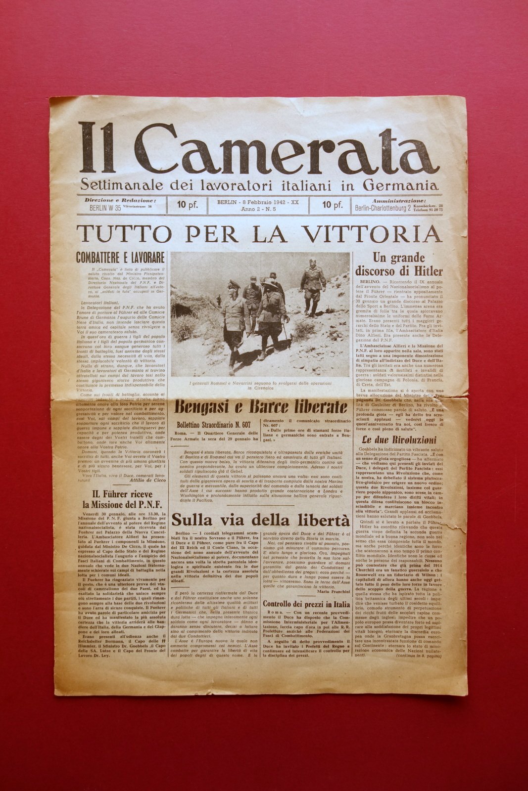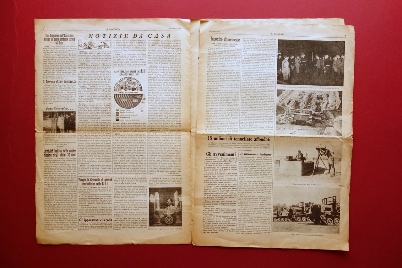 Giornale settimanale, Il Camerata" settimanale dei lavoratori italiani in Germania anno 2 - numero 5 Berlino, 8 febbraio 1942 Berlino 1942; cm 46x32; pp. 8 con alcune ill. fotografiche in b/n; esemplare a fogli sciolti. Numero completo. Condizioni di conservazione Buone condizioni con tracce d'uso, normale ingiallimento dovuto al tipo di carta, piega centrale di conservazione; margini e angoli leggermente sgualciti, con qualche piccolo / minimo strappetto. Per ulteriori dettagli vedi foto. Raro. Completo. SC03.D17922 N F "