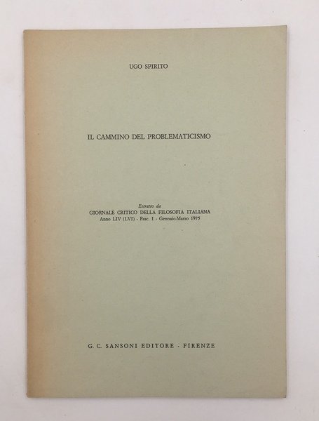 IL CAMMINO del PROBLEMATICISMO. Corposo estratto dal Giornale critico della Filosofia Italiana, anno LIV, fasc, 1, genn.-marzo 1975.