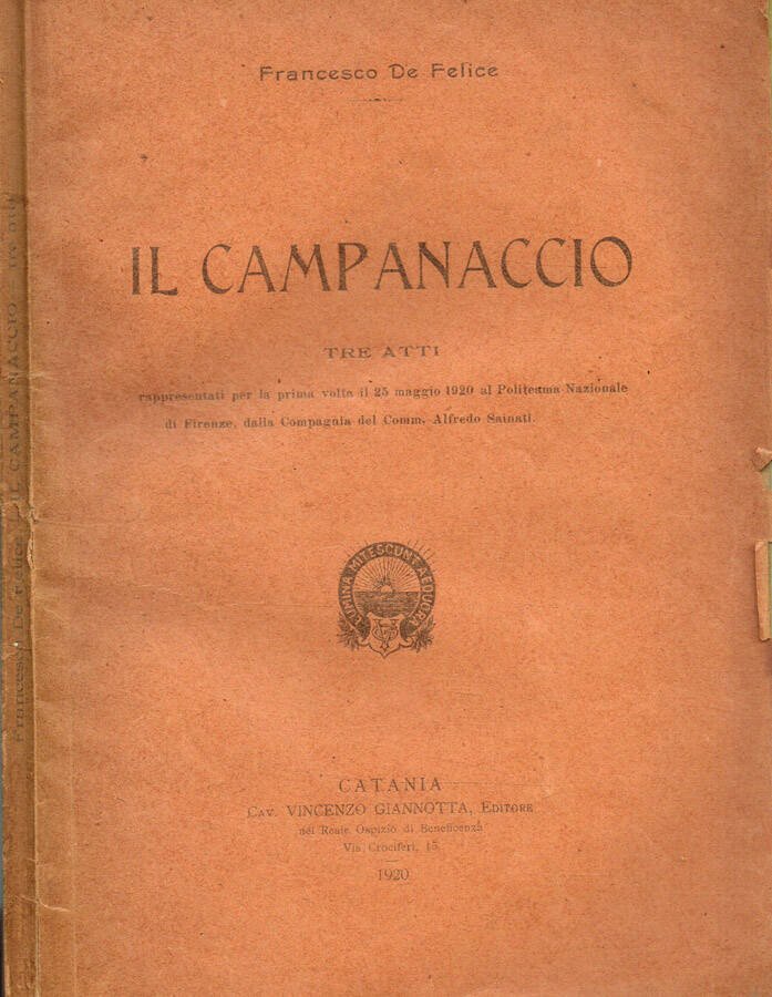 Lunga dedica a G.Ruberti datata ed autografata dall'A.De Felice all'occhiello, traduzione dal siciliano, opera rappresentata per la I volta il 25 mag.1920 al Politeama Naz.di Firenze, ritratto in nero all'antiporta, pagine leggermente brunite e con fioritura, solo alcune molto brunite, brossura editoriale morbida, parzialmente brunita, con usura e strappetti ai bordi, piccole macchie al posteriore, tagli non rifilati Numero Pagine 90