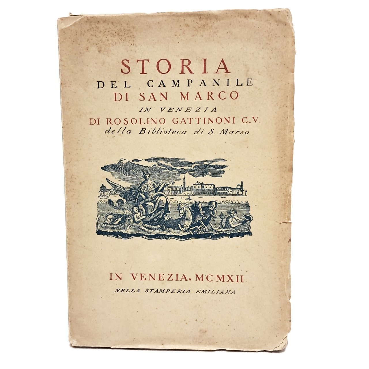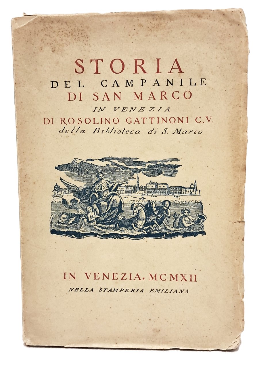 PRIMA EDIZIONE in un numero limitato di esemplari Prima edizione introvabile della piccola monografia sul campanile di San Marco a Venezia, vittima del crollo nel 1902. Indice: Storia della torre dalla fondazione alla caduta, Le campane, L'angelo, Varietà, Il crollo e la ricostruzione. In brossura con incisioni nel testo. Pp. 144. Buone condizioni.