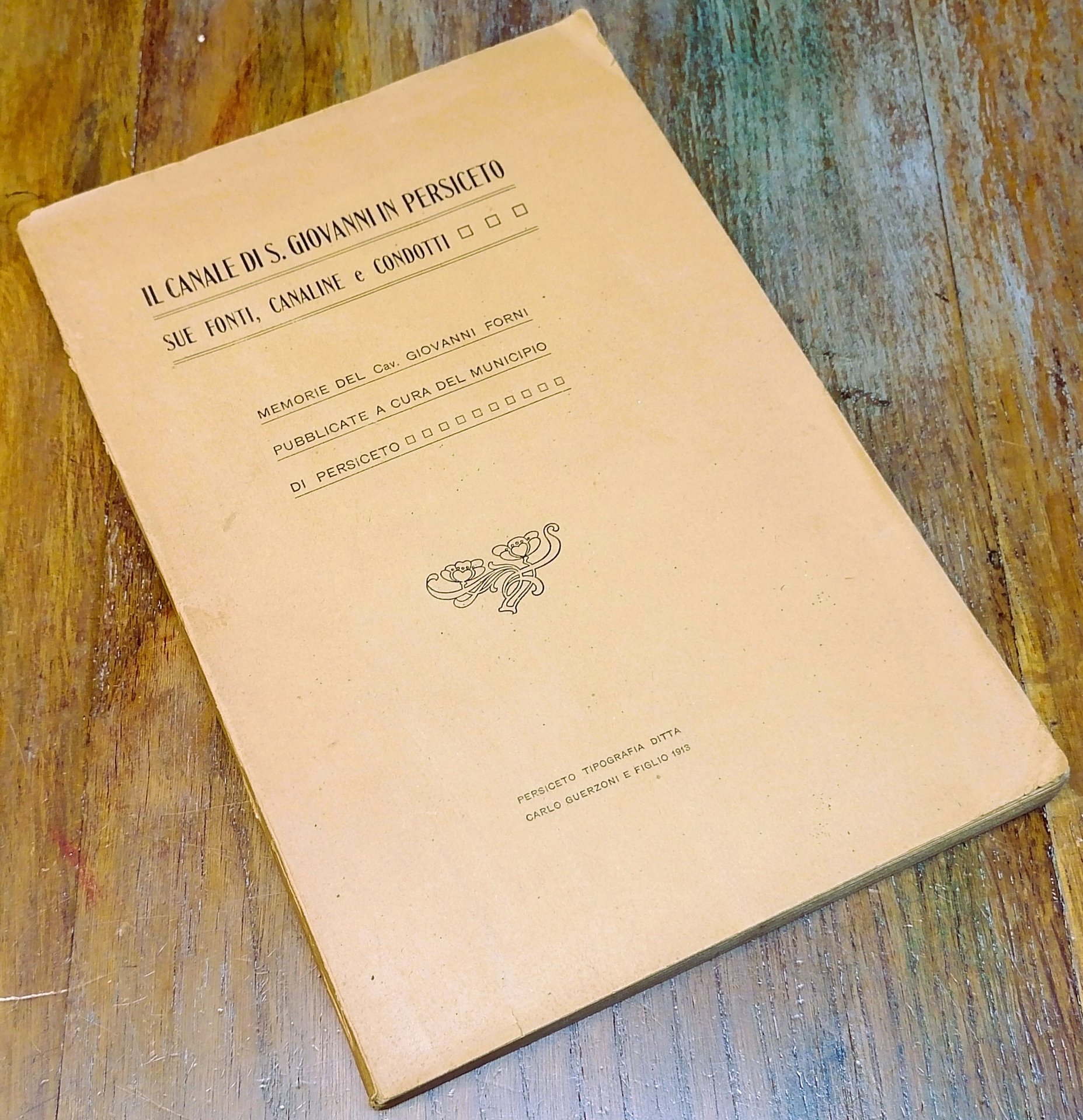 (Provincia di Bologna; San Giovanni in Persiceto; Idraulica) In 8°, brossura editoriale con titoli in nero su fondo ocra chiaro, pp. 170. Memorie del Cav. Giovanni Forni pubblicate a cura del Municipio di Persiceto sul Canale di San Giovanni. Alcune tracce di ossidazione ma buon esemplare, integro ed ancora intonso.
