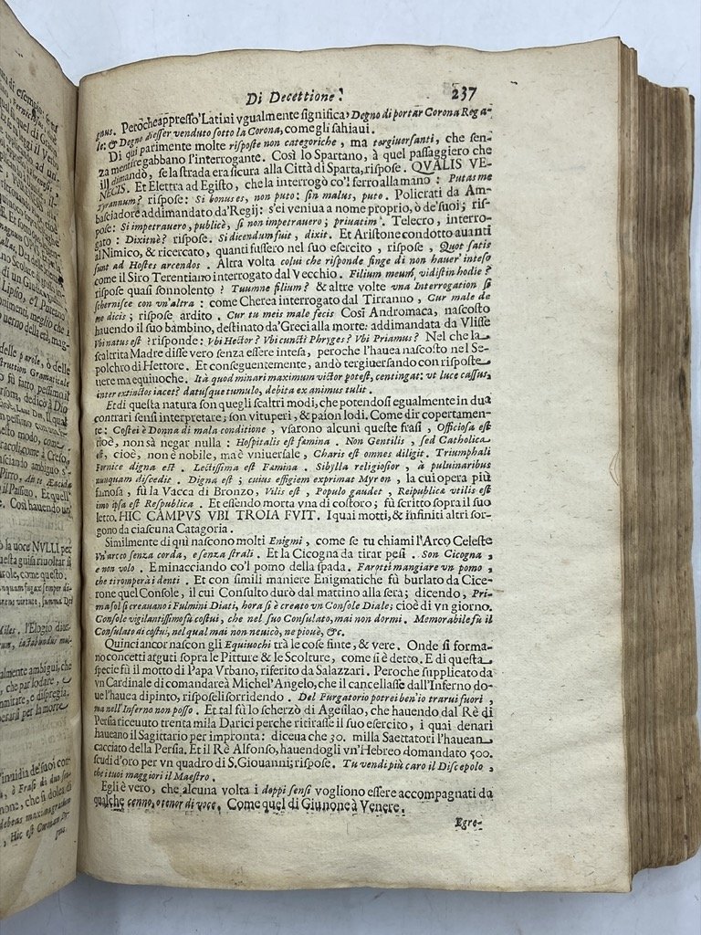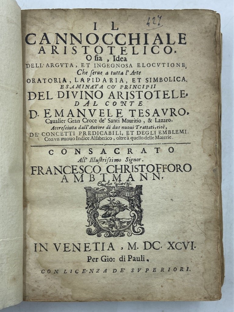 IL CANNOCCHIALE ARISTOTELICO, O SIA, IDEA DELL’ARGUTA, ET INGEGNOSA ELOCUTIONE CHE SERVE ALL’ARTE ORATORIA, LAPIDARIA ET SIMBOLICA. Esaminata con principii del Divino Aristotele dal Conte D. Emanuele Tesauro. Accresciuta dall’autore di due nuovi trattati, cioè de’ concetti predicabili, et degli emblemi. Con un nuovo Indice Alfabetico, oltre a quello delle Materie. IN VENETIA, M. DC. XCVI. Per Gio. Di Pauli.