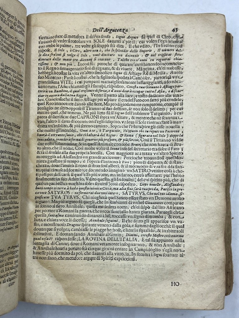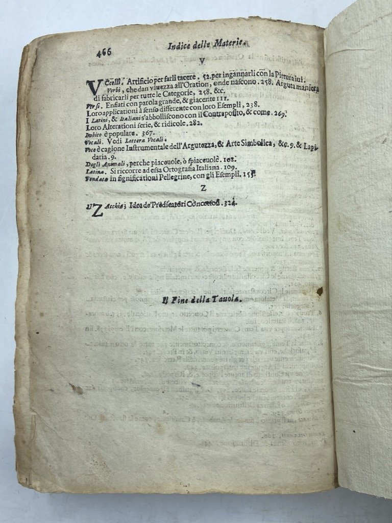 Legatura d’epoca in piena pergamena con titoli manoscritti sul dorso, in ottavo cm 22.5 x 17, pp (16) 466, impresa editoriale sul frontespizio e capolettera xilografici. Sguardie presumibilmente sostituite, gore diffuse, qualche rara annotazione a lapis e matita blu e rossa, firma di proprietà, peraltro complessivamente ben conservato. Non comune edizione veneziana del più celebre lavoro di Emanuele Tesauro, trattato di retorica pubblicato originariamente nel 1654 e più volte rielaborato dall’autore. L’opera s’incentra sull’idea della significazione arguta ossia della metafora come strumento d’invenzione e conoscenza. Pietra miliare dell’estetica barocca, «enciclopedia della metafora come strumento conoscitivo e modello interpretativo del reale» e «trattato che spinge alle soglie dell’estetica moderna la dimensione gnoseologica della scrittura letteraria» (Doglio, Storia di Torino IV, 2002), Il Cannocchiale Aristotelico fu particolarmente apprezzato da Umberto Eco, che gli ne mutuò il titolo per un capitolo de «L’isola del giorno prima» in cui introdusse come personaggio l’autore, definendolo altrove «disordinatamente strutturalista». Questa edizione dell’opera include anche i due trattati sulle «argutezze concettose» per la predicazione e sugli emblemi. Praz, Studies in XVII Centrury Imagery, p. 513 (edizioni anteriori); Vinciana, 3729: «Edizione sconosciuta alle principali bibliografie»; Graesse VII, p. 72 cita la ristampa del 1702 per lo stesso editore.