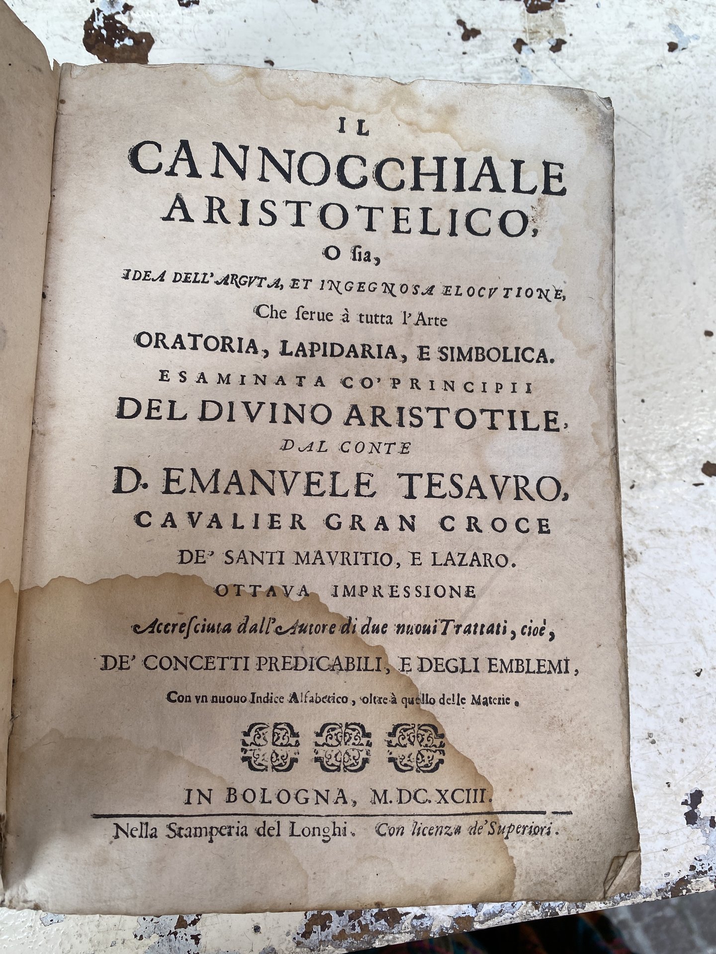 Questa l’edizione del 1693, una macchia al frontespizio e una meraviglia il suo contenuto: arguzie, allegorie, emblemi, soluzioni dotte e acculturate.