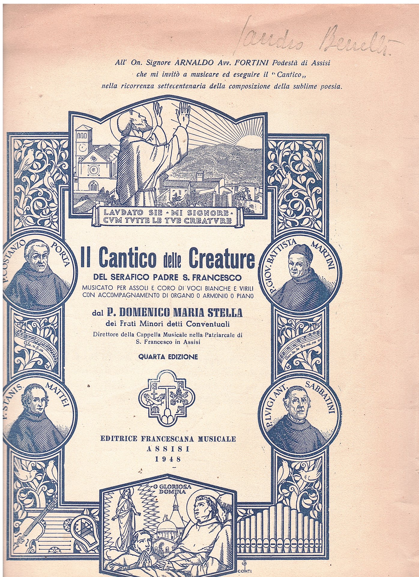 IL CANTICO DELLE CRATURE DEL SERAFICO PADRE S. FRANCESCO MUSICATO PER ASSOLI E CORO DI VOCI BIANCHE E VIRILI CON ACCOMPAGNAMENTO DI ORGANO O ARMONIO O PIANO DAL P. DOMENICO MARI STELLA DEI FRATI MINORI DETTI CONVENTUALI