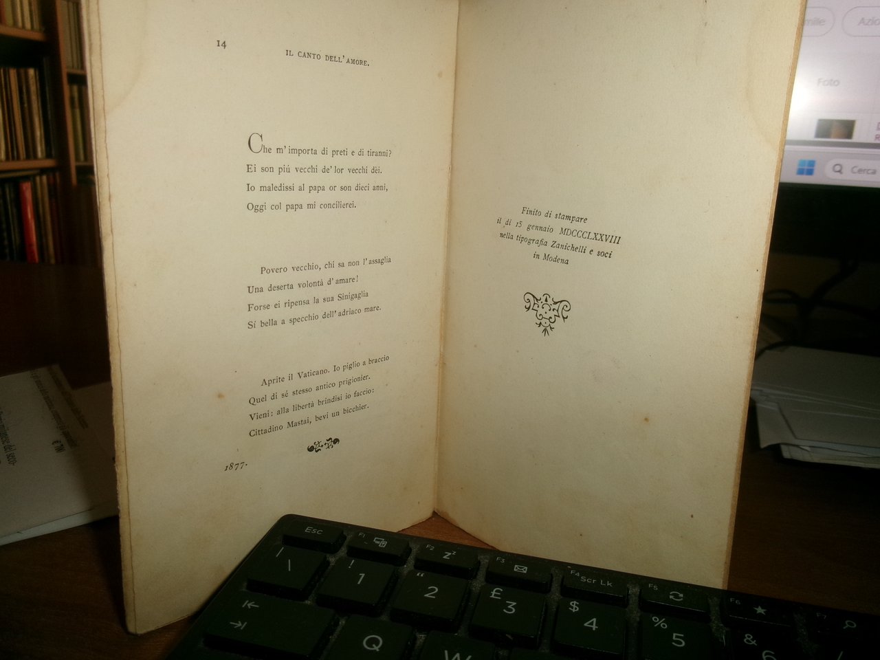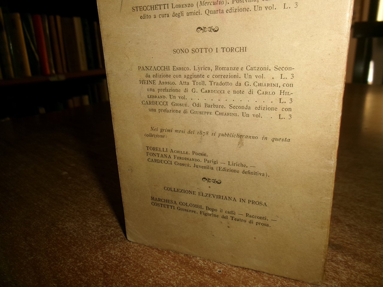 Carducci, Giosuè. Bologna, Nicola Zanichelli, 1878. In-16°, br., cop. orig. 14, (2) pp. Edizione originale. Parenti, Prime edizioni italiane, p. 128. Naturali segni del tempo ma ben conservato. Neg. mob. 6. in busta trasp.
