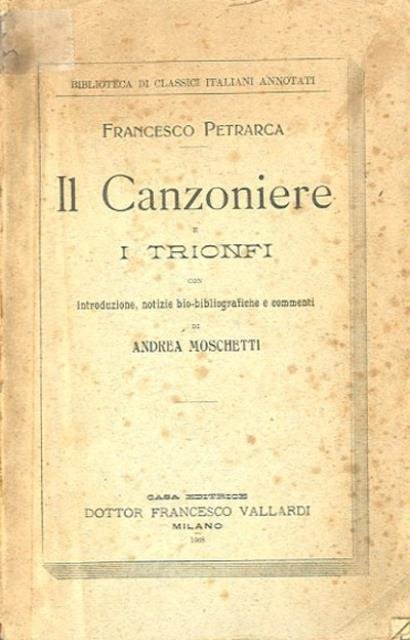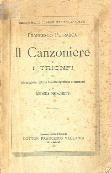 LXVI, 517 p. ; 20 x 13 cm. Biblioteca di classici italiano annotati. Introduzione, notizie bio-bibliografiche e commenti di Andrea Moschetti. Brossura editoriale, coperta in cartoncino flessibile con titolo impresso in nero al piatto e al dorso. Segni del tempo alla coperta, al dorso, al taglio e ai profili (piccole lacerazioni e fioriture). Carta interna ingiallita con alcune sottolineature a matita, per il resto libro accettabile, da studio. Codice libreria 4985.