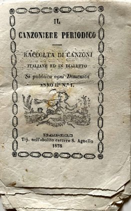 Napoli, Tip. nell’abolito carcere S. Agnello, 1878. In 16mo (cm. 16); pp. 16. Un xilografia in fine. La chitarrella di L. Santacroce; Risposta alla Chitarella di Francesco Vassallo; Seconda risposta di Lettieri Giuseppe; Gisella di G.M., Lo Guammp nnammorato di Tommaso Riccio; Isso e Essa duetto di Vincenzo Morelli; Donna di Raffele de Lillo... Axs