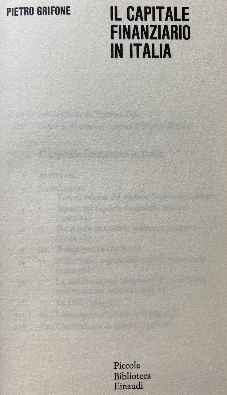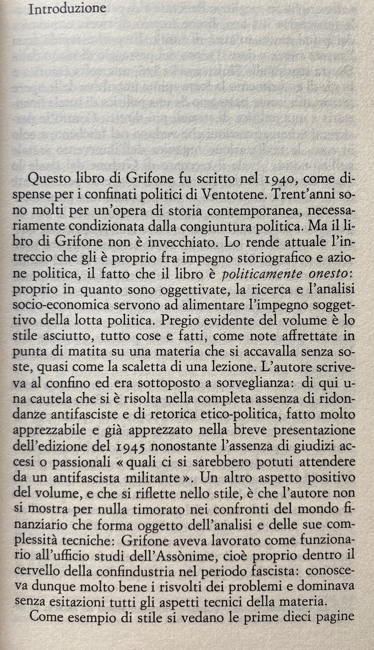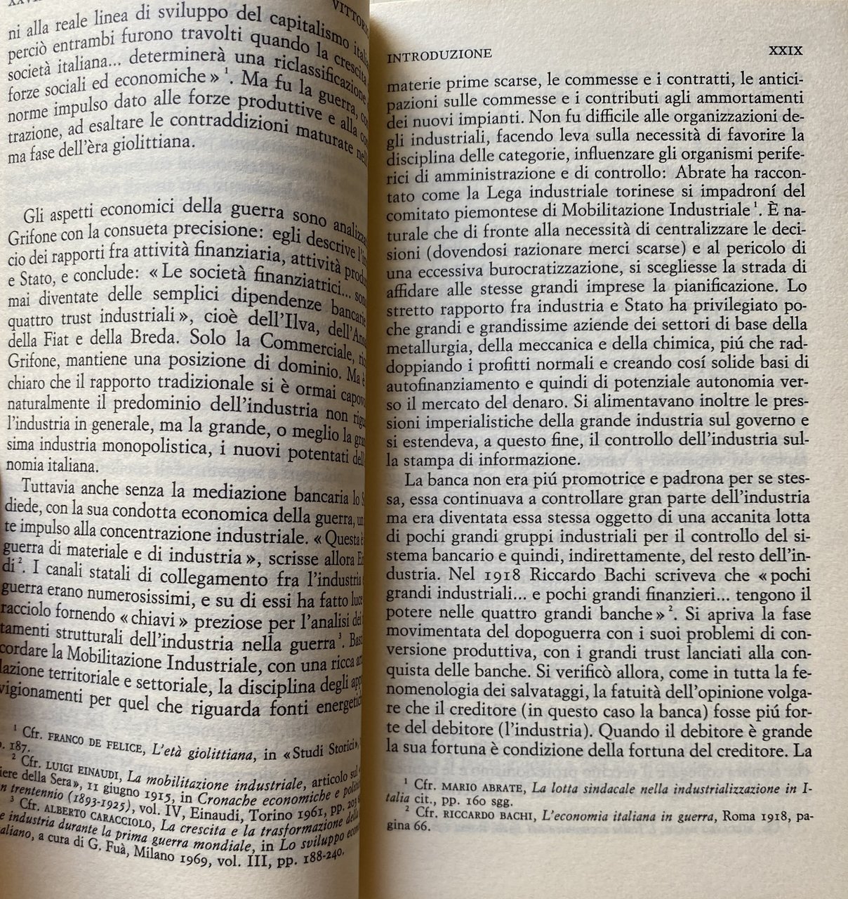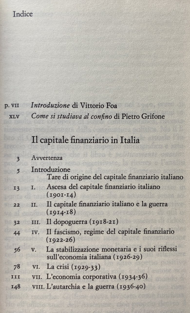 Soggetti: Storia contemporanea, Capitalismo italiano, Storia economica, Economia bellica, Finanza, Fascismo, Stato totalitario, Imperialismo fascista, Sistema bancario, Politica, Ideologie politiche, Nazionalismo, Capitale finanziario, Banche, Industria, Borghesia, Assonime, Confindustria, Congino, Ventotene, Dopoguerra, Seconda Guerra mondiale, Corporativismo, Socialismo, Comunismo, Destra, Sinistra, Analisi, Classe dirigente, Movimento operaio, Credito, Debito, Lira, Moneta, Colonie africane, Corporazioni, Pace, Sanzioni, Piano regolatore, Autarchia, Produzione, Materie prime, Risorse energetiche, Finanziamenti, Mobilitazione, Lenin, Monopolistico, Industria chimica, elettrica, Governo, Agricoltura, Ingerenza, Fabbriche, Grano, Mercato granario, Consorzi agrari, Confederazione, Agricoltori, Inflazione, Prezzi, Tesoro, Profitti, Grandi proprietari, Contadini, Latifondisti, Sud, Valpadana, Concorrenza, Mercato nero, Pane, Commercio, Requisizioni, Federcanapa, Liberalismo, Libertà, Pomodoro, Tabacco, Cotone, Lana, Juta, Vino, Importazioni, Cereali, Frutta, Bonifica, Benito Mussolini, Bilancia commerciale, Concimi, Oro, Stampa fascista, Appezzamenti, Coloni, Oltremare, Ferrara, Littoria, Braccianti, Compagnie, Semi oleosi, Cotone, Cellulosa, Caffè, Artigianato, Manodopera, Lavoro, Seta, Tessile, Cotonifici, Rayon, Sperequazione, Salario, Acciaierie Falck, Italcementi, Edison, Costo, Denaro, Rincaro, Carbone, Ferro, Legname, Petrolio, Cemento, Trasporti, Potere, Privilegi, Concentrazione, Monopolio, Oligopolio, Concorrenza, Donegani, Lancia, Rivetti, Utili, Dividendi, Risparmio, Dazi, Tasse, Esenzioni, Romeo, Officine ferroviarie, Breda, Banco di Roma, Lombardia, Veneto, Proletariato, Sindacati, Anic, Azienda petroli albanesi, FFSS, Agip, Demagogia, Populismo, Azienda minerali Africa orientale, Interessi, Edilizia, Ricostruzione, Welfare, Piano Marshall, Adriatica, Sip, Motta, Tariffe, Stipel, Italgas, Marghera, Ilva, Assicurazioni Generali, Segré, Distillerie italiane, Croccolo, Metallurgia, Acciaio, Piombo, Benzina, Rame, Ferro, Siderurgia, Zinco, Alluminio, Carestia, Carlo Erba, Etiopia, Abissinia, Eritrea, Libia, Esportazioni, Marxismo, Giorgio Amendola, PCI, Partito comunista, Opposizione, Dissenso, Consenso, Anni Trenta, Anni Quaranta, Anni Cinquanta, Riforma bancaria, Finanze, Nuovo ordine mondiale, Alleati, Rosario Romeo, Affaristi, Graziani, Badoglio, Hitler, Dirigismo, Ettore Conti, Socialdemocrazia, Russia, Unione sovietica, Salvataggio, Imprese, Alberto De Stefani, Ansaldo, Renzo De Felice, Camilla Ravera, Anna Bietolini, Gabriele Mazzotta, Antonio Cantero, Adone Zoli, Chiesa, Cgil, Emilio Sereni, Bonomi, Rendite, Speculazione, Riconversione, Deficit, Giovanna Marturano, Antifascismo, Intellettuali, Saggi storici, Collezionismo, Riferimento, Bibliografia, Libri Vintage fuori catalogo, Ponza, Dissidenti, Confida, Operai, Sciopero, Giulio Pietranera, l'Unità, Fausto Gullo, Questione meridionale, Coltivatori diretti, Palmiro Togliatti, Vie nuove, Matteotti, Pietro Secchia, M. Mammucari, Umberto Terracini, Liberazione, Eugenio Curiel, G. Di Vittorio, G. Li Causi, E. Rossi, R. Bauer, E. Colorni, Paolo Spriano, Lelio Basso, Bottai, IRI, Dalmine, Napoli, Bagnoli, Pomigliano, Thuile, Cogne, Sestri, Pozzuoli, Genova, Brown, Bocciardo, Sesto San Giovanni, Corriere della Sera, Sole 24 ore, Propaganda, Contraddizioni, Cassa Depositi, Prestiti, Sicilia, Giolitti, Antonio Gramsci, Zanardelli, Pelloux, Saracco, Di Rudini, Resistenza, Jannaccone, Salvemini, Beneduce, Paratore, Menichella, Volpi, Giampiero Carocci, Sindacalismo, Lotta di classe, Mario Abbate, Luigi Einaudi, Economisti, Riccardo Bachi, Sonnino, Stagnazione, Bruno Buozzi, Giuliano Procacci, Dittatura, Rivoluzione, Internazionale, Raniero Panzieri, Alberto Aquarone, Federico Chabod, Trust, Contemporary history, Italian capitalism, Economic history, War economics, Finance, Fascism, Totalitarian state, Fascist imperialism, Banking system, Politics, Political ideologies, Nationalism, Financial capital, Banks, Industry, Bourgeoisie, Post-war period, Second World War, Corporatism, Socialism, Communism, Right, Left, Analysis, Ruling class, Workers' movement, Credit, Debt, Lira, Currency, African colonies, Corporations, Peace, Sanctions, Master plan, Autarky, Production, Raw materials, Energy resources, Financing, Mobilization, Monopolistic , Chemical and electrical industry, Government, Agriculture, Interference, Factories, Grain, Agrarian consortia, Confederation, Farmers, Inflation, Prices, Treasury, Profits, Large landowners, Peasants, Landowners, South, Valpadana, Competition, Black market, Bread, Commerce, Requisitions, Federcanapa, Liberalism, Freedom, Tomato, Tobacco, Cotton, Wool, Jute, Wine, Imports, Cereals, Fruit, Reclamation, Trade balance, Fertilizers, Gold, Fascist press, Plots, Settlers, Overseas, Laborers, Companies, Oilseeds, Cotton, Cellulose, Coffee, Craft, Labor, Work, Silk, Textile, Cotton mills, Inequality, Wage, Steel mills, Cost, Money, Markup, Coal, Iron, Timber, Oil, Cement, Transport, Power, Privileges, Concentration, Monopoly, Oligopoly, Competition, Profits, Dividends, Savings, Duties, Taxes, Exemptions, Railway workshops, Proletariat, Unions, Albanian oil company, Demagogy, Populism, Mineral company, Interests, Construction, Reconstruction, Tariffs, Insurance Generali, Italian distilleries, Metallurgy, Steel, Lead, Petrol, Copper, Iron, Steel, Aluminium, Famine, Ethiopia, Abyssinia, Libya, Exports, Communist Party, Opposition, Dissent, Consensus, Thirties, Forties, Fifties, Banking reform, Finances, New world order, Allies, Businessmen, Dirigisme, Social democracy, Soviet Union, Rescue, Businesses, Church, Income, Speculation, Reconversion, Anti-fascism, Intellectuals, Historical essays, Collectibles, Reference, Bibliography, Books out of print, Dissidents, Workers, Strike, Southern question, Direct farmers, Naples, Contradictions, Loans, Sicily, Trade unionism, Class struggle, Stagnation, Dictatorship, 