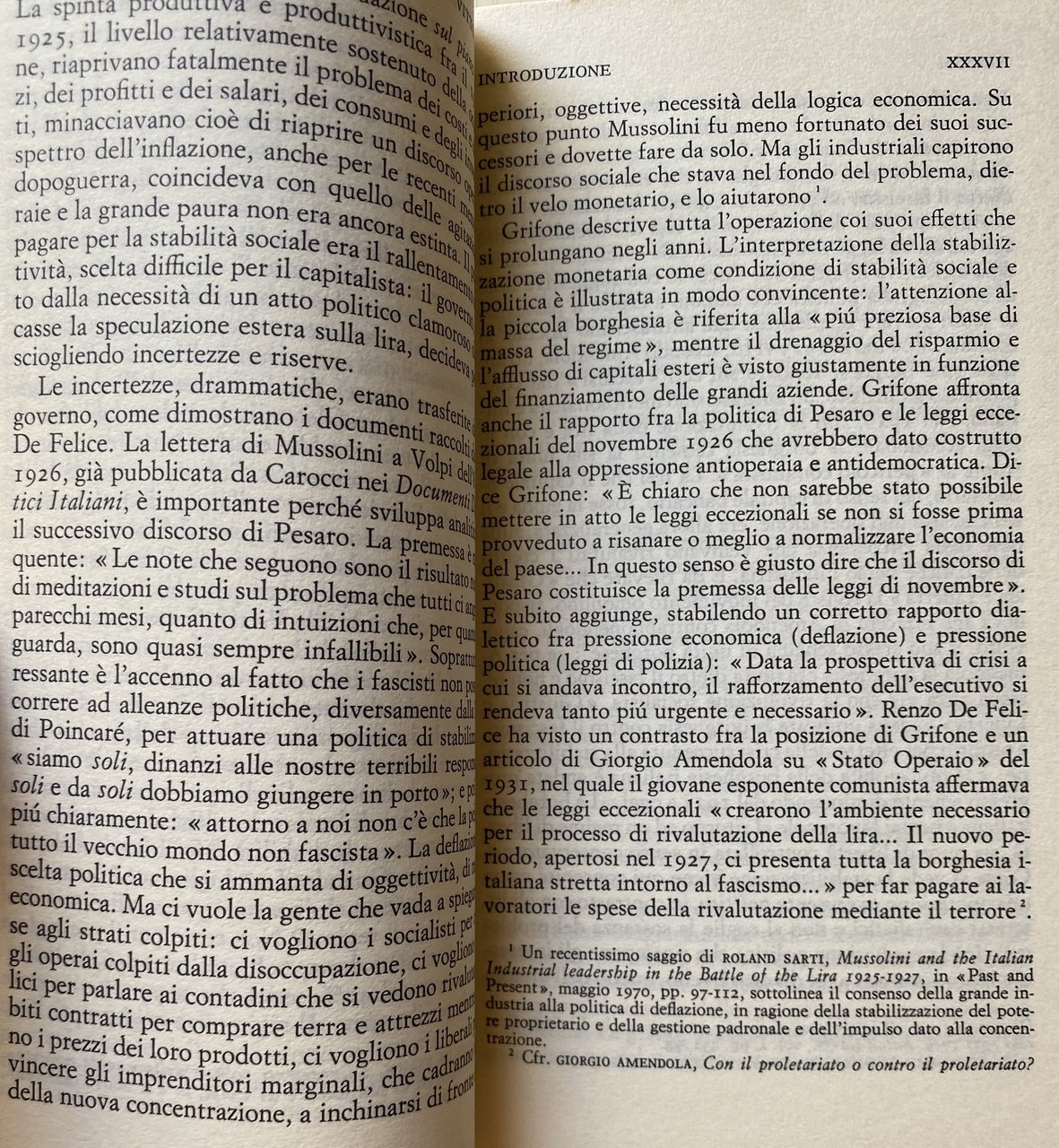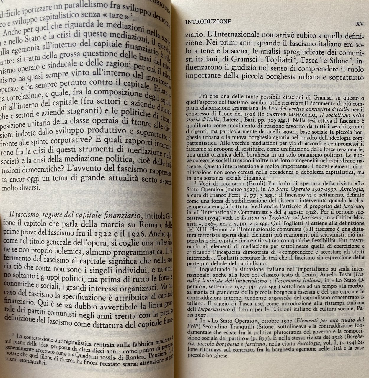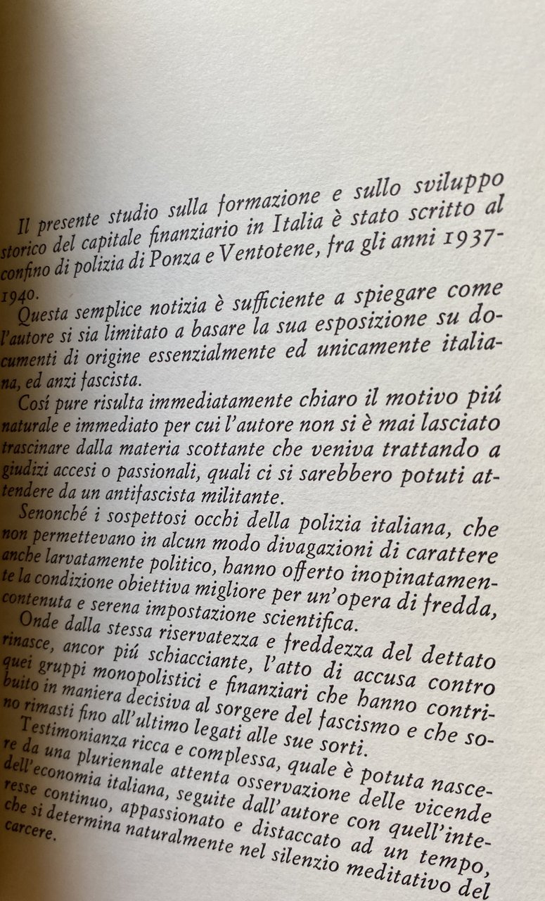 Soggetti: Storia contemporanea, Capitalismo italiano, Storia economica, Economia bellica, Finanza, Fascismo, Stato totalitario, Imperialismo fascista, Sistema bancario, Politica, Ideologie politiche, Nazionalismo, Capitale finanziario, Banche, Industria, Borghesia, Assonime, Confindustria, Congino, Ventotene, Dopoguerra, Seconda Guerra mondiale, Corporativismo, Socialismo, Comunismo, Destra, Sinistra, Analisi, Classe dirigente, Movimento operaio, Credito, Debito, Lira, Moneta, Colonie africane, Corporazioni, Pace, Sanzioni, Piano regolatore, Autarchia, Produzione, Materie prime, Risorse energetiche, Finanziamenti, Mobilitazione, Lenin, Monopolistico, Industria chimica, elettrica, Governo, Agricoltura, Ingerenza, Fabbriche, Grano, Mercato granario, Consorzi agrari, Confederazione, Agricoltori, Inflazione, Prezzi, Tesoro, Profitti, Grandi proprietari, Contadini, Latifondisti, Sud, Valpadana, Concorrenza, Mercato nero, Pane, Commercio, Requisizioni, Federcanapa, Liberalismo, Libertà, Pomodoro, Tabacco, Cotone, Lana, Juta, Vino, Importazioni, Cereali, Frutta, Bonifica, Benito Mussolini, Bilancia commerciale, Concimi, Oro, Stampa fascista, Appezzamenti, Coloni, Oltremare, Ferrara, Littoria, Braccianti, Compagnie, Semi oleosi, Cotone, Cellulosa, Caffè, Artigianato, Manodopera, Lavoro, Seta, Tessile, Cotonifici, Rayon, Sperequazione, Salario, Acciaierie Falck, Italcementi, Edison, Costo, Denaro, Rincaro, Carbone, Ferro, Legname, Petrolio, Cemento, Trasporti, Potere, Privilegi, Concentrazione, Monopolio, Oligopolio, Concorrenza, Donegani, Lancia, Rivetti, Utili, Dividendi, Risparmio, Dazi, Tasse, Esenzioni, Romeo, Officine ferroviarie, Breda, Banco di Roma, Lombardia, Veneto, Proletariato, Sindacati, Anic, Azienda petroli albanesi, FFSS, Agip, Demagogia, Populismo, Azienda minerali Africa orientale, Interessi, Edilizia, Ricostruzione, Welfare, Piano Marshall, Adriatica, Sip, Motta, Tariffe, Stipel, Italgas, Marghera, Ilva, Assicurazioni Generali, Segré, Distillerie italiane, Croccolo, Metallurgia, Acciaio, Piombo, Benzina, Rame, Ferro, Siderurgia, Zinco, Alluminio, Carestia, Carlo Erba, Etiopia, Abissinia, Eritrea, Libia, Esportazioni, Marxismo, Giorgio Amendola, PCI, Partito comunista, Opposizione, Dissenso, Consenso, Anni Trenta, Anni Quaranta, Anni Cinquanta, Riforma bancaria, Finanze, Nuovo ordine mondiale, Alleati, Rosario Romeo, Affaristi, Graziani, Badoglio, Hitler, Dirigismo, Ettore Conti, Socialdemocrazia, Russia, Unione sovietica, Salvataggio, Imprese, Alberto De Stefani, Ansaldo, Renzo De Felice, Camilla Ravera, Anna Bietolini, Gabriele Mazzotta, Antonio Cantero, Adone Zoli, Chiesa, Cgil, Emilio Sereni, Bonomi, Rendite, Speculazione, Riconversione, Deficit, Giovanna Marturano, Antifascismo, Intellettuali, Saggi storici, Collezionismo, Riferimento, Bibliografia, Libri Vintage fuori catalogo, Ponza, Dissidenti, Confida, Operai, Sciopero, Giulio Pietranera, l'Unità, Fausto Gullo, Questione meridionale, Coltivatori diretti, Palmiro Togliatti, Vie nuove, Matteotti, Pietro Secchia, M. Mammucari, Umberto Terracini, Liberazione, Eugenio Curiel, G. Di Vittorio, G. Li Causi, E. Rossi, R. Bauer, E. Colorni, Paolo Spriano, Lelio Basso, Bottai, IRI, Dalmine, Napoli, Bagnoli, Pomigliano, Thuile, Cogne, Sestri, Pozzuoli, Genova, Brown, Bocciardo, Sesto San Giovanni, Corriere della Sera, Sole 24 ore, Propaganda, Contraddizioni, Cassa Depositi, Prestiti, Sicilia, Giolitti, Antonio Gramsci, Zanardelli, Pelloux, Saracco, Di Rudini, Resistenza, Jannaccone, Salvemini, Beneduce, Paratore, Menichella, Volpi, Giampiero Carocci, Sindacalismo, Lotta di classe, Mario Abbate, Luigi Einaudi, Economisti, Riccardo Bachi, Sonnino, Stagnazione, Bruno Buozzi, Giuliano Procacci, Dittatura, Rivoluzione, Internazionale, Raniero Panzieri, Alberto Aquarone, Federico Chabod, Trust, Contemporary history, Italian capitalism, Economic history, War economics, Finance, Fascism, Totalitarian state, Fascist imperialism, Banking system, Politics, Political ideologies, Nationalism, Financial capital, Banks, Industry, Bourgeoisie, Post-war period, Second World War, Corporatism, Socialism, Communism, Right, Left, Analysis, Ruling class, Workers' movement, Credit, Debt, Lira, Currency, African colonies, Corporations, Peace, Sanctions, Master plan, Autarky, Production, Raw materials, Energy resources, Financing, Mobilization, Monopolistic , Chemical and electrical industry, Government, Agriculture, Interference, Factories, Grain, Agrarian consortia, Confederation, Farmers, Inflation, Prices, Treasury, Profits, Large landowners, Peasants, Landowners, South, Valpadana, Competition, Black market, Bread, Commerce, Requisitions, Federcanapa, Liberalism, Freedom, Tomato, Tobacco, Cotton, Wool, Jute, Wine, Imports, Cereals, Fruit, Reclamation, Trade balance, Fertilizers, Gold, Fascist press, Plots, Settlers, Overseas, Laborers, Companies, Oilseeds, Cotton, Cellulose, Coffee, Craft, Labor, Work, Silk, Textile, Cotton mills, Inequality, Wage, Steel mills, Cost, Money, Markup, Coal, Iron, Timber, Oil, Cement, Transport, Power, Privileges, Concentration, Monopoly, Oligopoly, Competition, Profits, Dividends, Savings, Duties, Taxes, Exemptions, Railway workshops, Proletariat, Unions, Albanian oil company, Demagogy, Populism, Mineral company, Interests, Construction, Reconstruction, Tariffs, Insurance Generali, Italian distilleries, Metallurgy, Steel, Lead, Petrol, Copper, Iron, Steel, Aluminium, Famine, Ethiopia, Abyssinia, Libya, Exports, Communist Party, Opposition, Dissent, Consensus, Thirties, Forties, Fifties, Banking reform, Finances, New world order, Allies, Businessmen, Dirigisme, Social democracy, Soviet Union, Rescue, Businesses, Church, Income, Speculation, Reconversion, Anti-fascism, Intellectuals, Historical essays, Collectibles, Reference, Bibliography, Books out of print, Dissidents, Workers, Strike, Southern question, Direct farmers, Naples, Contradictions, Loans, Sicily, Trade unionism, Class struggle, Stagnation, Dictatorship, 
