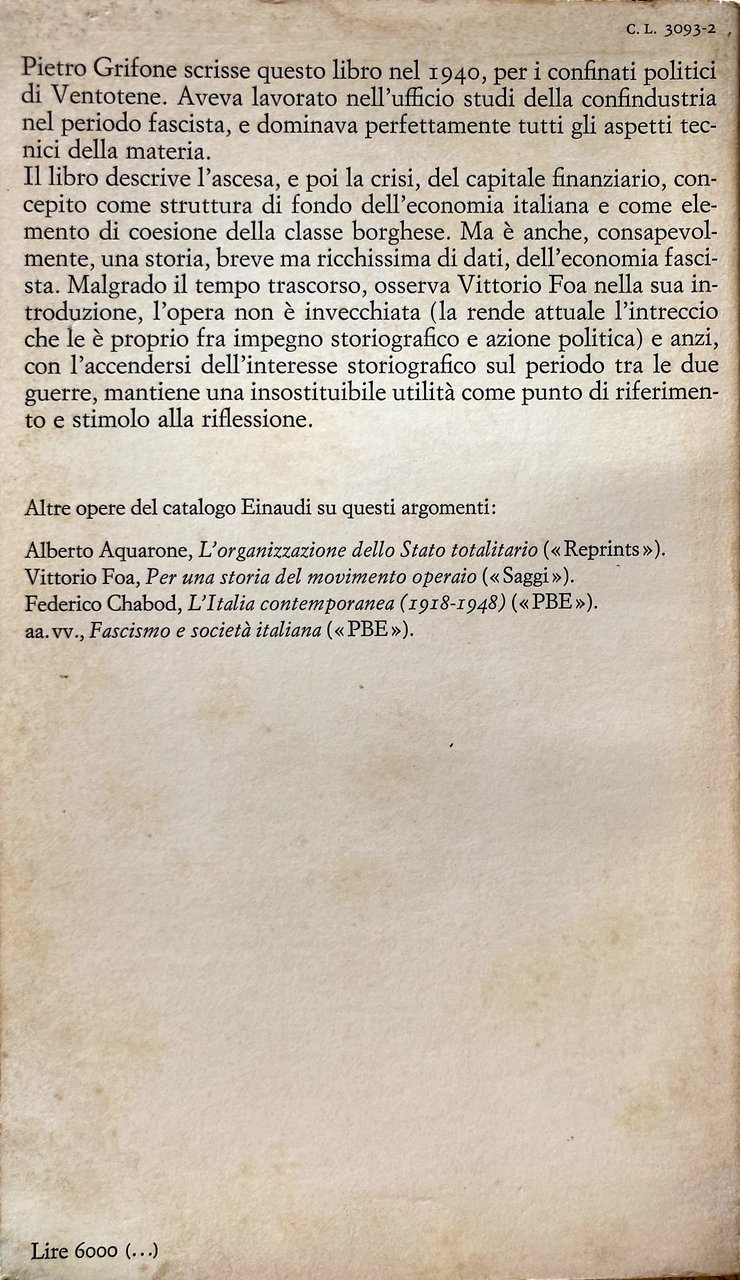 Pietro Grifone scrisse questo libro nel 1940, per i confinati politici di Ventotene. Aveva lavorato nell'ufficio studi della confindustria nel periodo fascista, e dominava perfettamente tutti gli aspetti tecnici della materia. Il libro descrive l'ascesa, e poi la crisi, del capitale finanziario, concepito come struttura di fondo dell'economia italiana e come elemento di coesione della classe borghese. Ma è anche, consapevolmente, una storia, breve ma ricchissima di dati, dell'economia fascista. Malgrado il tempo trascorso, osserva Vittorio Foa nella sua introduzione, l'opera non è invecchiata (la rende attuale l'intreccio che le è proprio fra impegno storiografico e azione politica) e anzi, con l'accendersi dell'interesse storiografico sul periodo tra le due guerre, mantiene una insostituibile utilità come punto di riferimento e stimolo alla riflessione.