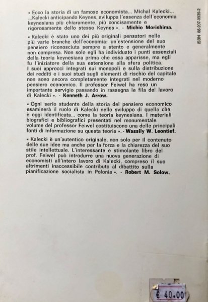 «Kalecki è stato uno dei più originali pensatori nelle più varie branche dell'economia: un'estensione del suo pensiero riconosciuta sempre a stento e generalmente non compresa. Non solo egli ha individuato i punti essenziali della teoria keynesiana prima che essa apparisse, ma egli fu l'iniziatore della sua estensione alla sfera politica. I suoi approcci integrati sui monopoli e sulla distribuzione dei redditi e i suoi studi sugli elementi di rischio del capitale non sono ancora completamente integrati nel moderno pensiero economico. Il professor Feiwel ha reso un importante servigio passando in rassegna le fila del lavoro di Kalecki». Kenneth J. Arrow.