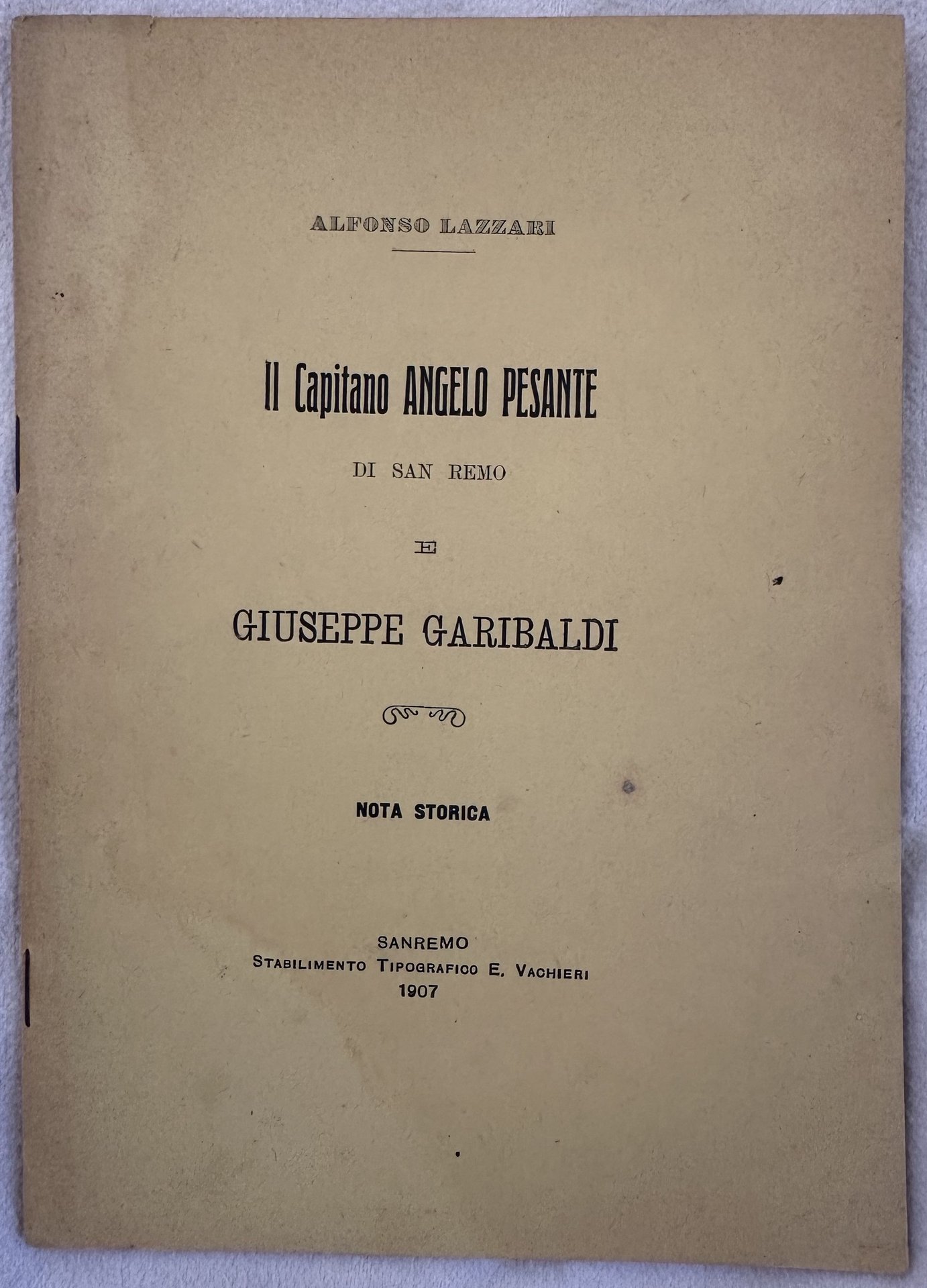Edizione del 1907 di questa pubblicazione sul Capitano Angelo Pesante di San Remo e Giuseppe Garibaldi a cura di Alfonso Lazzari. Alcune foto all'interno. In buone condizioni. Copertina editoriale in ottime condizioni con lievi usure ai margini e dorso. Legatura in buone condizioni. Pagine in ottime condizioni con rare fioriture. In 8. cm. 20x14,5. Pp. 23 Edition of 1907 of this pamphlet of the Captain Angelo Pesante of San Remo and Giuseppe Garibaldi cared by Alfonso Lazzari. Some photoes inside. In good conditions. Editorial cover in very good conditions lightly worn in the extremities. Binding in good conditions. Pages in very good conditions with occasional foxing. In 8. cm. 20x14,5. Pp. 23