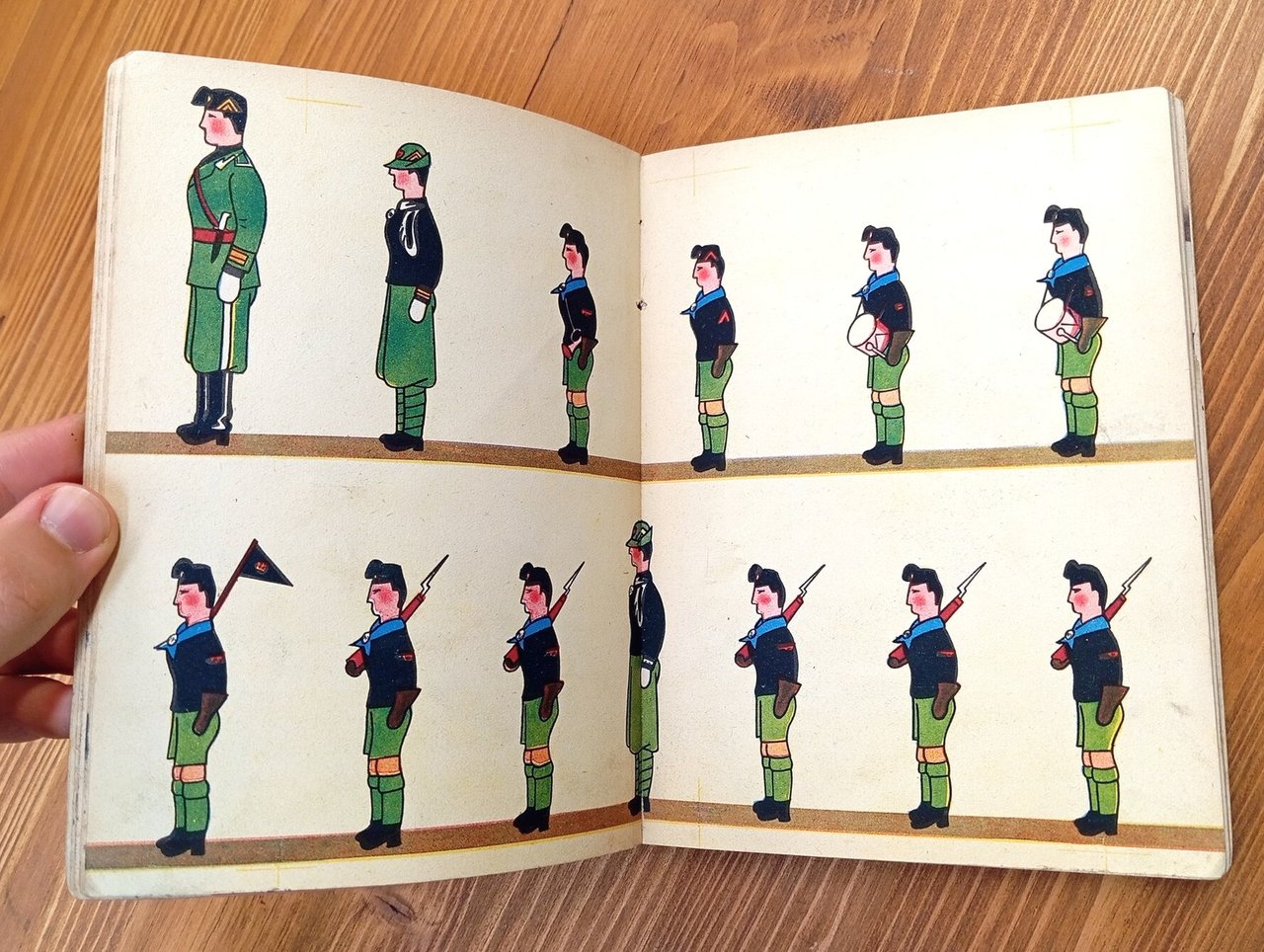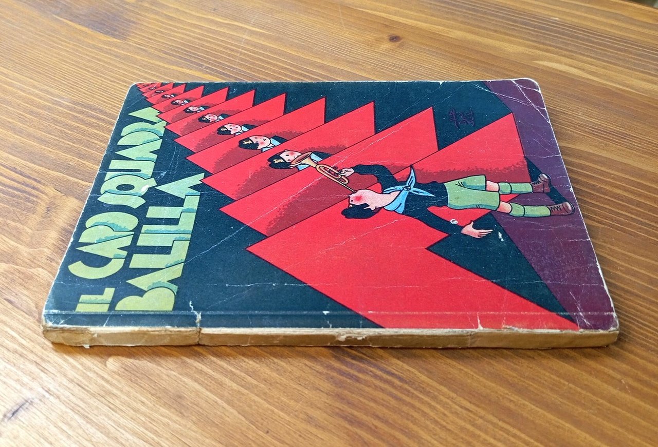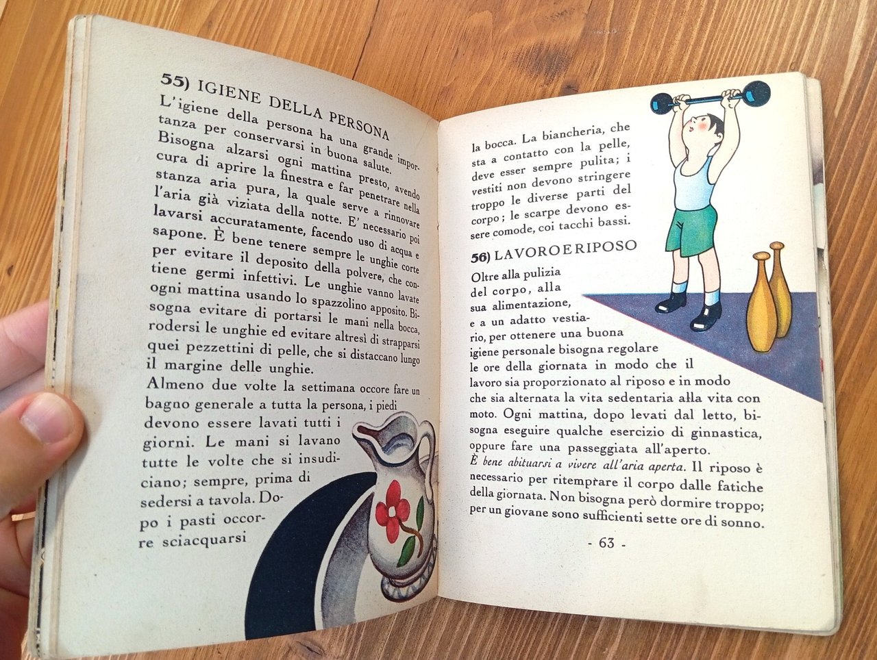 Quarta (IV) edizione, Anno XI E. F. - Brossura originale con copertina illustrata a colori da Raoul Verdini, 96 pagine con disegni a colori lungo l'intero testo; in chiusura facsimile di lettera autografa di Benito Mussolini. Coeva firma di possesso al frontespizio (classe scolastica 5^). Porzioni del dorso reincollate, normali segni del tempo, ma nel complesso esemplare integro e ben conservato, interno fresco e godibile -- Ricco manuale di istruzioni per balilla con le regole, le istruzioni di comportamento, i gradi, le divise, le armi, ecc. Raoul Verdini, illustratore del Marc'Aurelio e del Balilla, in seguito, nel dopoguerra diventerà redattore di testate come il Partigiano, il Pettirosso, Marforio, L'asino ecc.