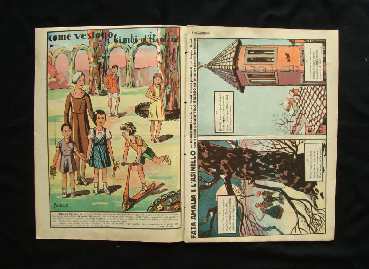 Rivista per bambini, IL CARTOCCINO DEI PICCOLI Anno V - N.158 - 1933-XI Monza, 1933, cm 33,5x24, pp. 15; rivista per bambini (giornale-giocattolo) illustrata a colori. Numero completo. Condizioni di conservazione. Esemplare in buono stato con tracce d'uso e del tempo, leggere bruniture ai margini; dorso con alcuni forellini e piccole mancanze per precedente rilegatura in volume unico, pagine sciolte; per condizioni vedi foto. Numero completo SC03.D14449 F blu BIS